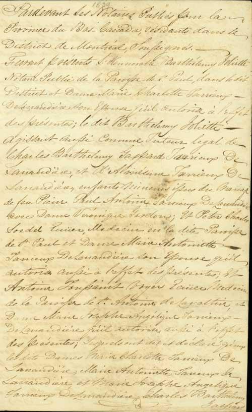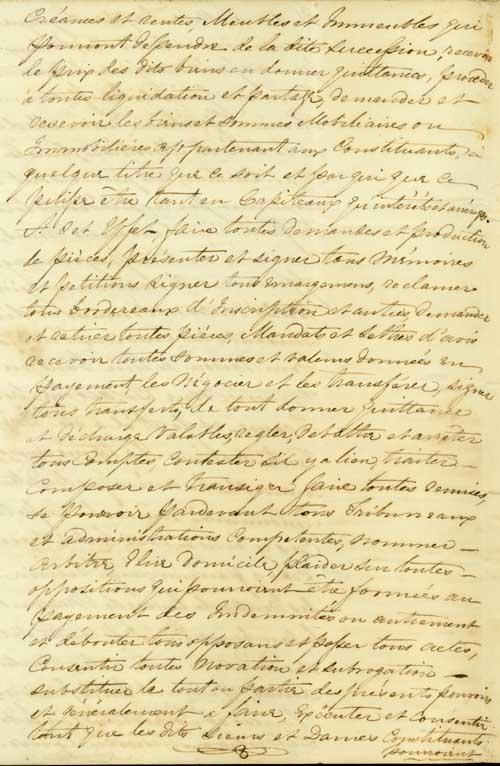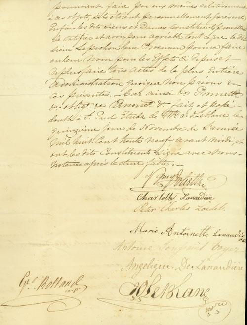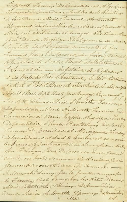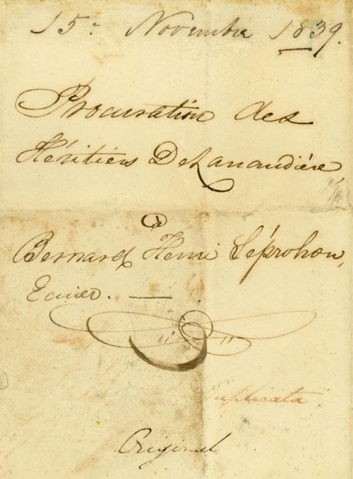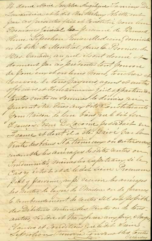 Document (Procuration de Barthélémy Joliette, tuteur des héritiers mineurs et autres de Marie Suzanne Antoinette Marganne de Lavaltrie, à Bernard Henri Leprohon, pour recouvrer ce qu'il pourra des biens de François Josué de Lacorne, vendus en France comme "biens nationaux")