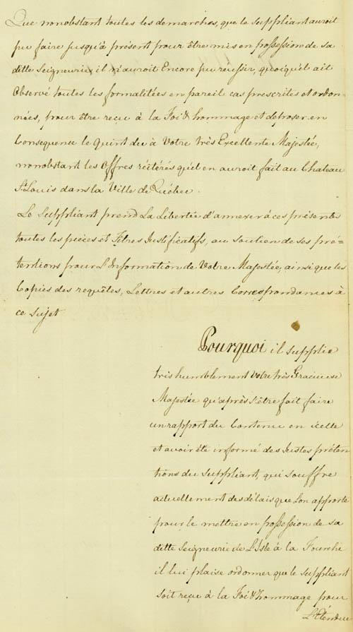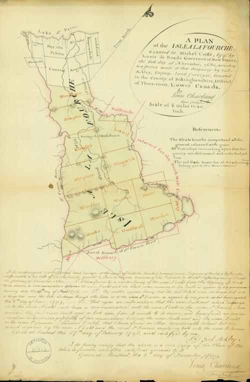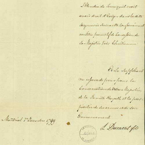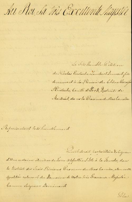 Document (Requête de Nicolas Eustache Lambert Dumont, fils, au Roi, demandant d'être mis en possession de l'Ile-à-la-Fourche. Avec plan en couleur par Louis Charland)