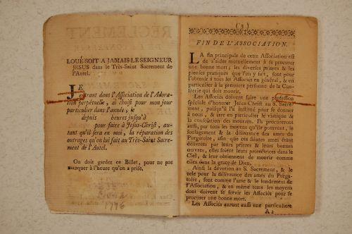 Livre (Règlement de la Confrérie de l'adoration perpétuelle du S. Sacrement et de la bonne mort. Érigée dans l'église paroissiale de Ville-Marie, en l'isle de Montréal, en Canada)