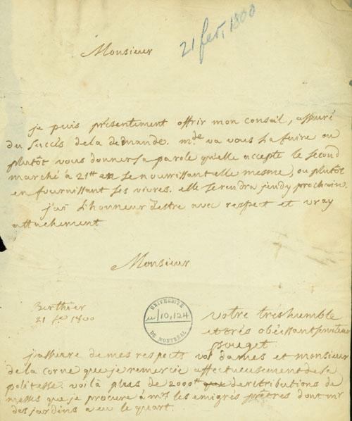 Document (Lettre de l'abbé Jean-Baptiste-Noël Pouget à Pierre-Paul Margane de Lavaltrie)