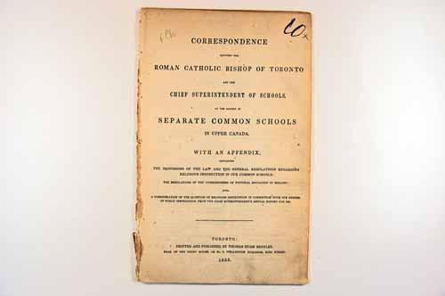 Brochure (Correspondence between the Roman Catholic bishop of Toronto and the chief superintendent of schools, on the subject of separate common schools in Upper Canada : with an appendix, containing the provisions of the law and the general regulations regarding religious instruction in our common schools, the regulations of the commissioners of national education in Ireland : also, a consideration of the question of religious instruction in connection with our system of public instruction, from the chief superintendent's annual report for 1851)