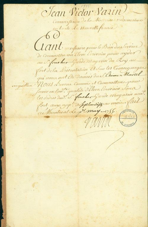 Document (Nomination de Étienne Martel comme élève-écrivain, au fort de la Présentation)
