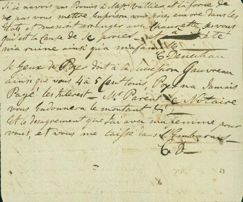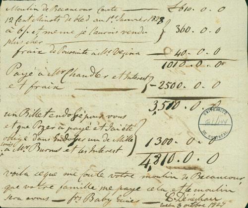 Document (Note de C. Denechau à François Baby lui reprochant les embarras qu'il éprouve à cause de lui au sujet d'un moulin à Bécancour)