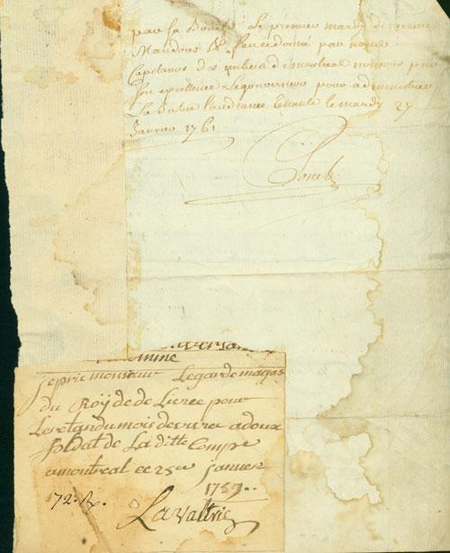 Document (Contestation entre Madame de Lavaltrie et Jean Laporte au sujet de fourniture de farine au munitionnaire, devant Panet, capitaine de milice)