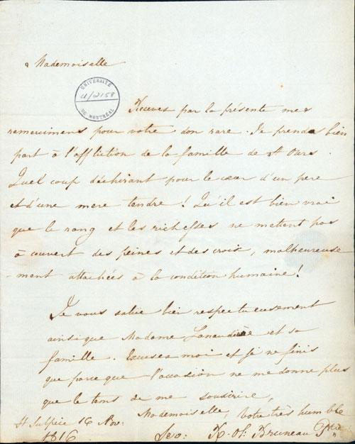 Document (Lettre de l'abbé X. O. Bruneau à De Lavaltrie)