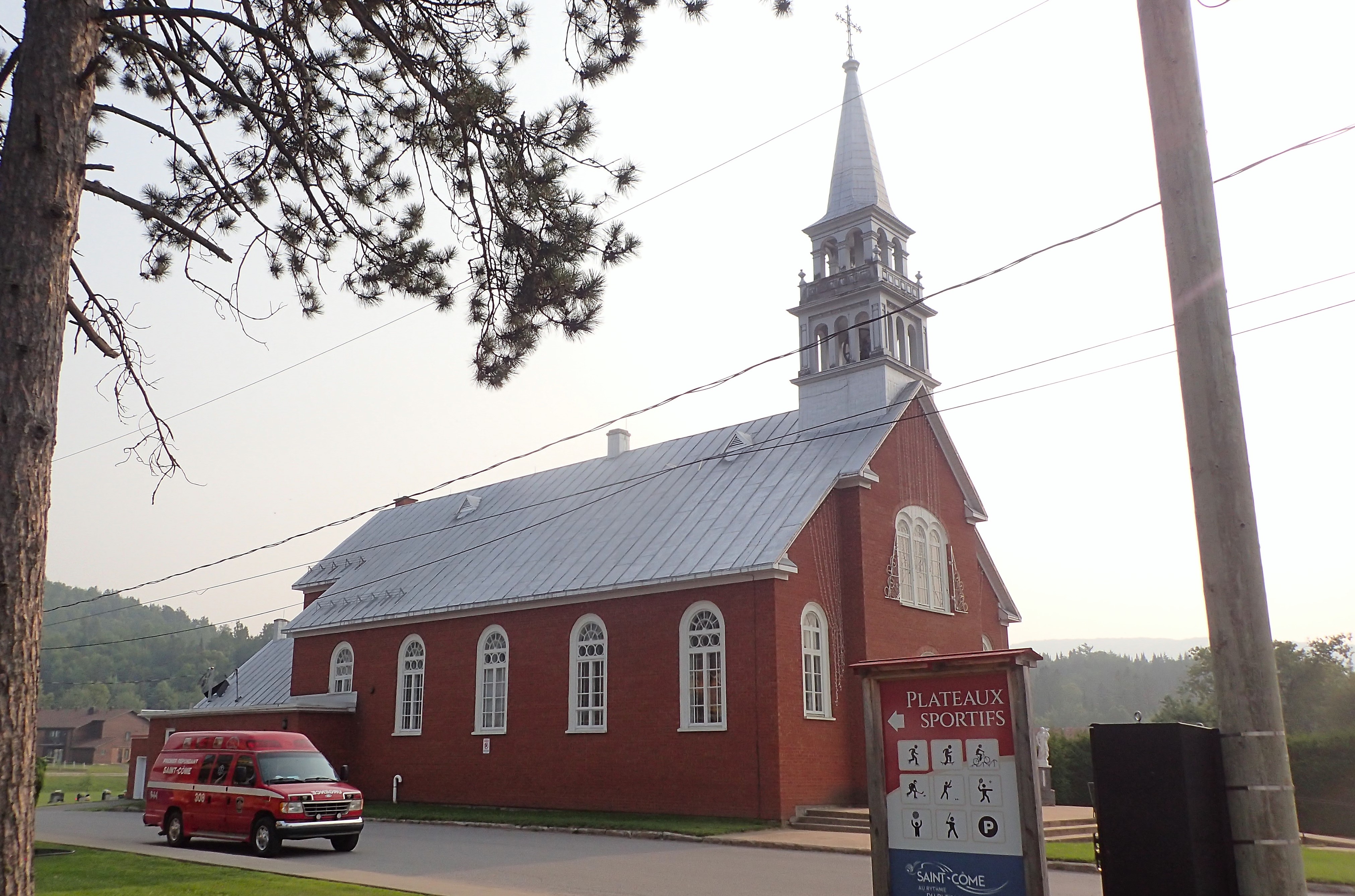 En 1863, un premier emplacement est choisi pour l'implantation des édifices religieux de ce territoire organisé en mission. Puisqu'il ne répond plus aux besoins de la population, un nouvel emplacement est déterminé en 1866. Ce dernier est localisé sur un plateau près de la chute à Bull. Le prêtre Jean-Hyacinthe Saint-Jacques est envoyé par l'évêque de Montréal en 1867 pour desservir la mission. Il fait construire une chapelle provisoire à partir d'une maison curiale inachevée ainsi qu'une résidence pour se loger. La paroisse est érigée canoniquement l'année suivante sous le vocable de Saint-Côme.