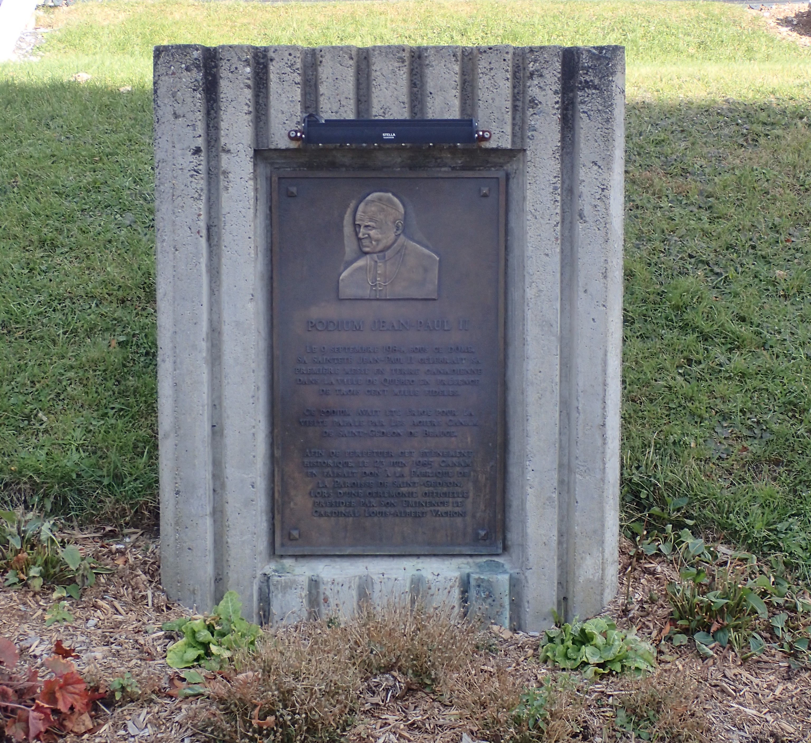 Podium papal utilisé lors de la visite de Jean-Paul II en 1984. Plaque commémorative : « Le 9 septembre 1984 sous ce dôme, sa Saintetée Jean-Paul II célébrait sa première messe en terre canadienne dans la ville de Québec en présence de trois cent mille fidèles. Ce podium avait été érigé pour la visite papale par les Aciers Canam de Saint-Gédéon de Beauce. Afin de perpétuer cet événement historique, le 23 juin 1985, Canam faisait don à la Fabrique de la Paroisse de Saint-Gédéon, lors d'une cérémonie officielle présidée par son Eminence le Cardinal Louis-Albert Vachon. »