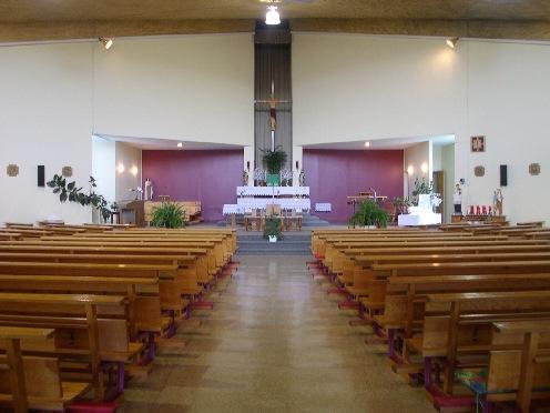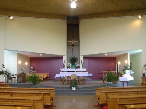 Le plan en forme de losange, comprenant des vestibules aux formes fluides à trois de ses angles, reprend la silhouette du poisson, symbole du Christ. C'est la première fois que Jean-Marie Roy s'éloigne du plan longitudinal traditionnel pour expérimenter une configuration plus libre où les bancs des fidèles sont orientés, en hémicycle, vers le point focal qu'est le chœur. La lumière naturelle, réfléchie par les murs en béton blanc, provient des verrières surmontant l'entrée principale et les entrées latérales. Malgré la modestie de ce bâtiment religieux, l'architecte n'a fait aucun compromis afin d'affirmer une modernité franche en exploitant au maximum les possibilités techniques de la construction.