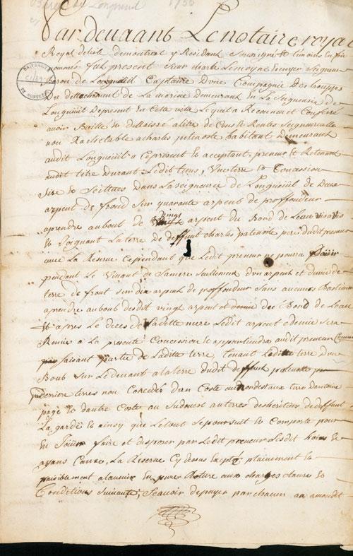 Document (Concession de terre à Longueuil, par Charles Lemoine, baron de Longueuil à Charles Patenoste)