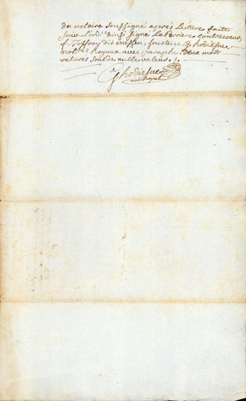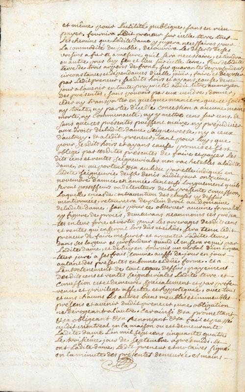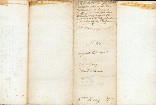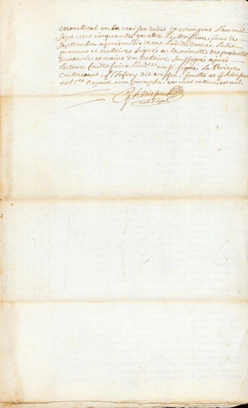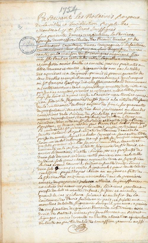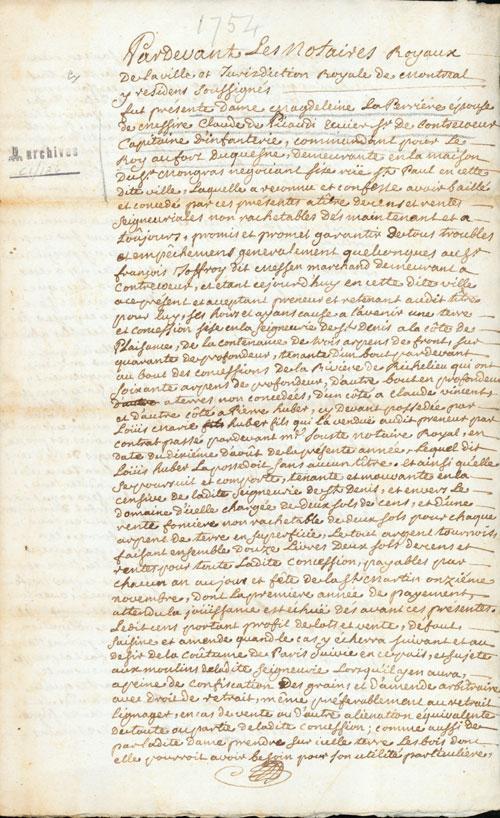 Document (Concession de terre, 3 arpents par 40, à la côte de Plaisance, par Madeleine Laperrière, femme de Claude Pécaudy de Contrecoeur à François Geoffroy dit Messier)