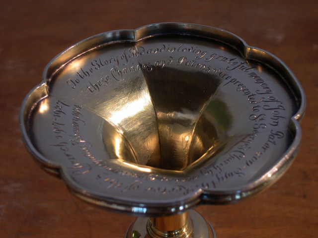 Sur le pied, sur la croix : INRI; dessous : To the Glory of God and in Loving grateful memory of John Paterson Smyth, Rector of this Church 1907-1927 / These Chalices and Patens were presented to the St. George's Church by members of his congregation, Febuary, 1934.