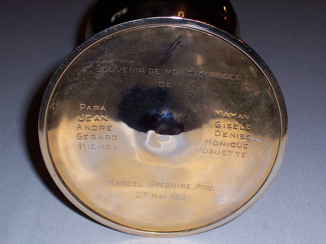 Dessous : SOUVENIR DE MON SACERDOCE / DE / PAPA / JEAN / ANDRÉ / GÉRARD / MICHEL / MAMAN / GISÈLE / DENISE / MONIQUE / HUGUETTE / MARCEL GRÉGOIRE, PTRE. / 27 MAI 1961