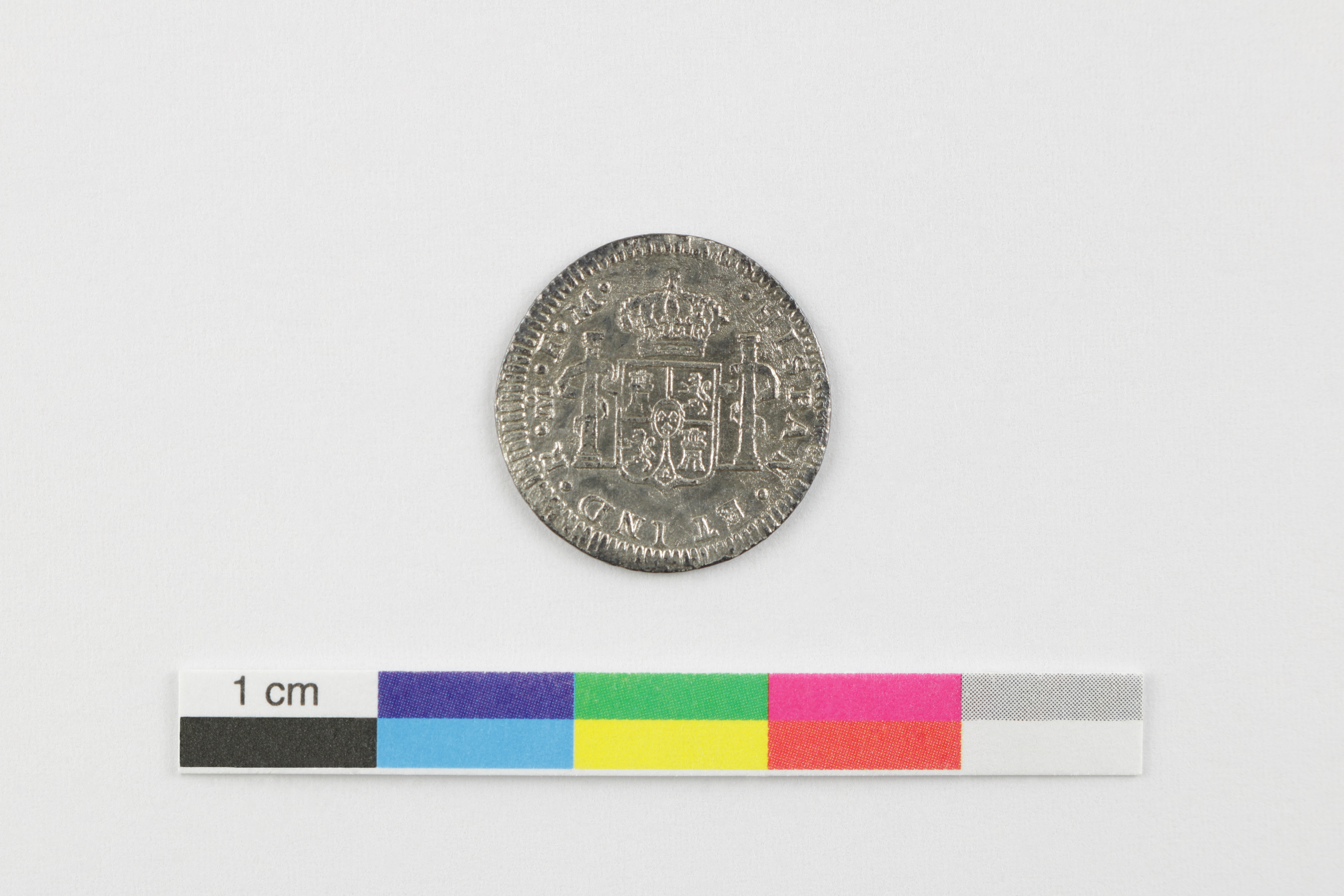 La monnaie, frappée en 1784, est un objet lié au commerce. Ce disque circulaire plat en argent mesure 1,75 cm de diamètre. L'avers de la pièce affiche le buste de Charles III, alors que le revers présente un écu couronné aux armes de Castille et de Léon flanqué des colonnes d'Hercule.