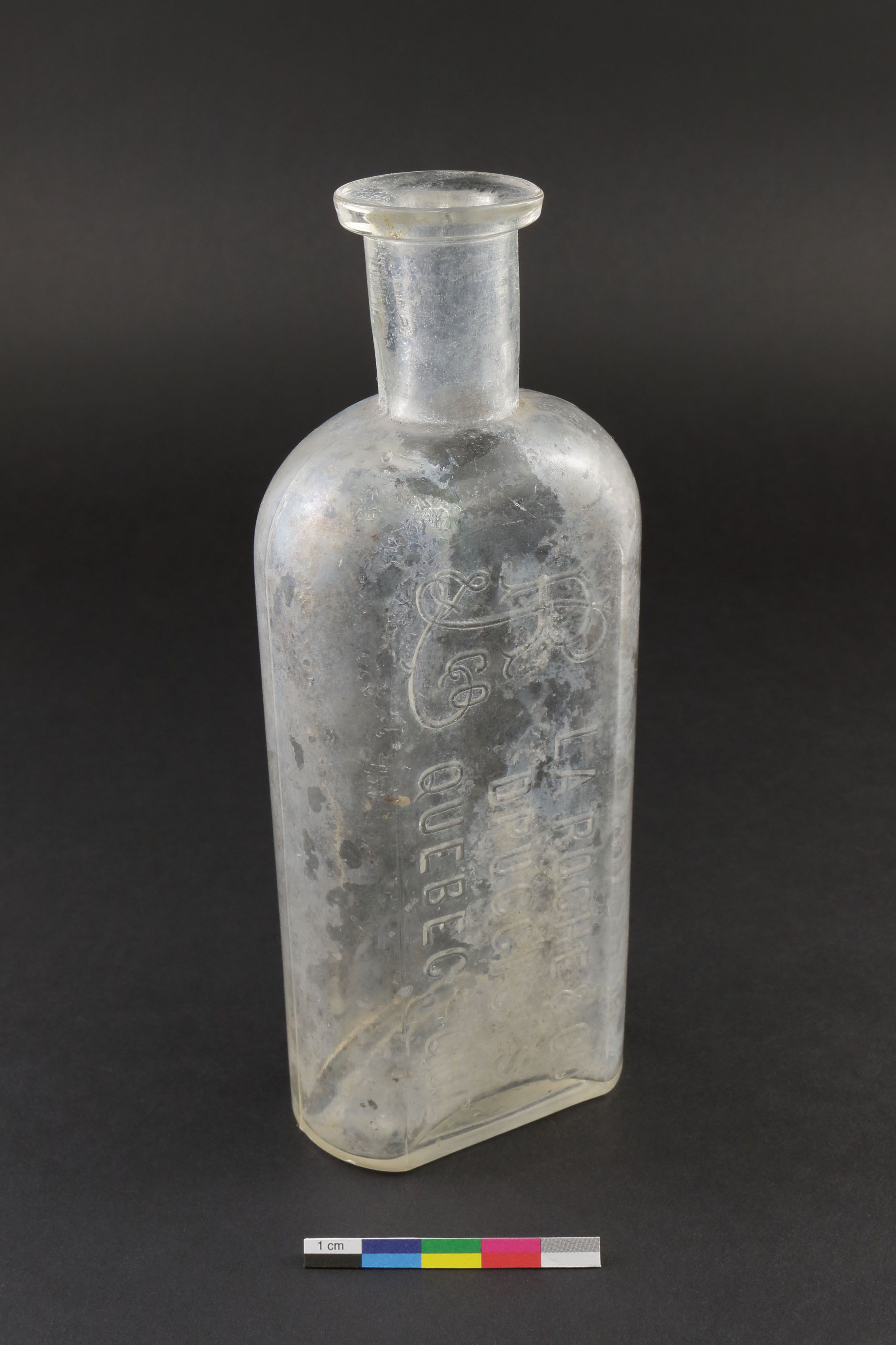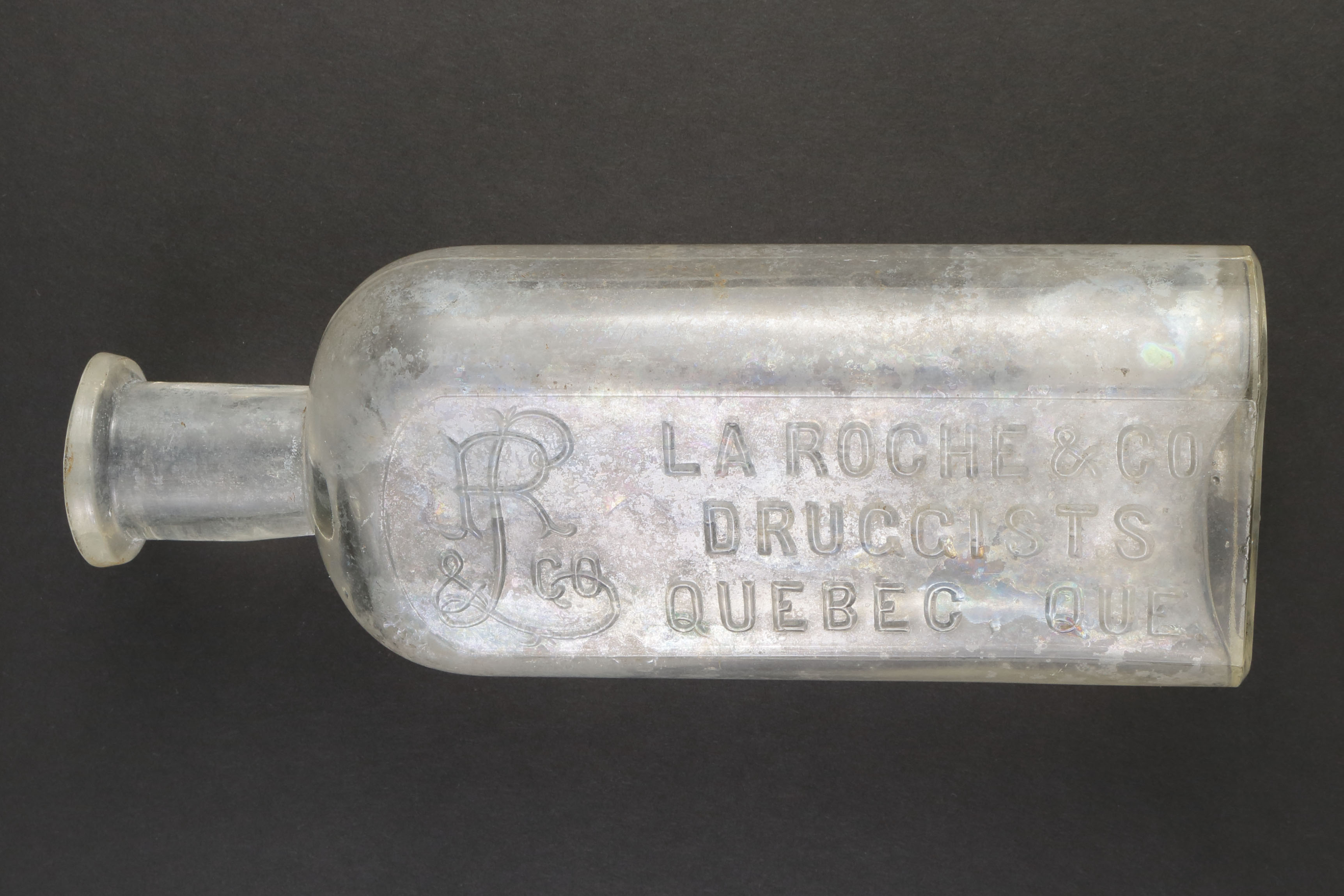 La bouteille d'apothicaire est un récipient à usage pharmaceutique. Bien que le contenu de celle-ci demeure encore inconnu, les inscriptions moulées sur le corps permettent d'identifier la compagnie pharmaceutique offrant ce produit, la pharmacie La Roche & Co. de Québec. William H. Laroche (1845-1912), déjà propriétaire d'une pharmacie dans les années 1870, fonde en 1880 son entreprise qui est située au 14 ou 15 rue De Buade à Québec. La compagnie pharmaceutique commence à porter le nom « La Roche & Co. » vers 1882. Elle demeure sur la rue De Buade jusqu'en 1896, année où elle déménage au 4, rue de la Fabrique. D'après les publicités, la pharmacie vend une panoplie de produits, tels que des brosses à dents, des brosses à cheveux, des articles de toilette, des cosmétiques, des parfums, des outils chirurgicaux, et bien évidemment des médicaments et prescriptions.