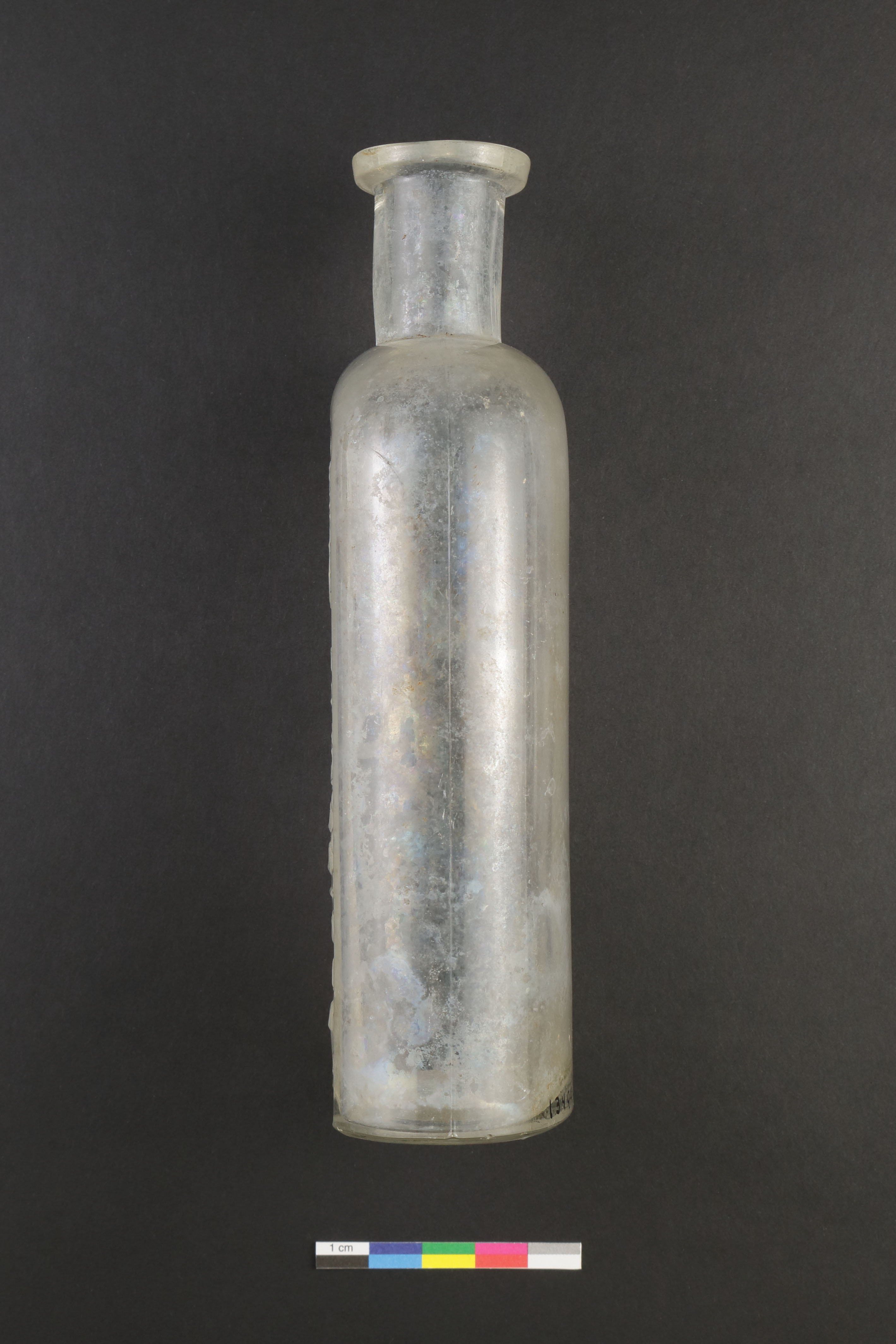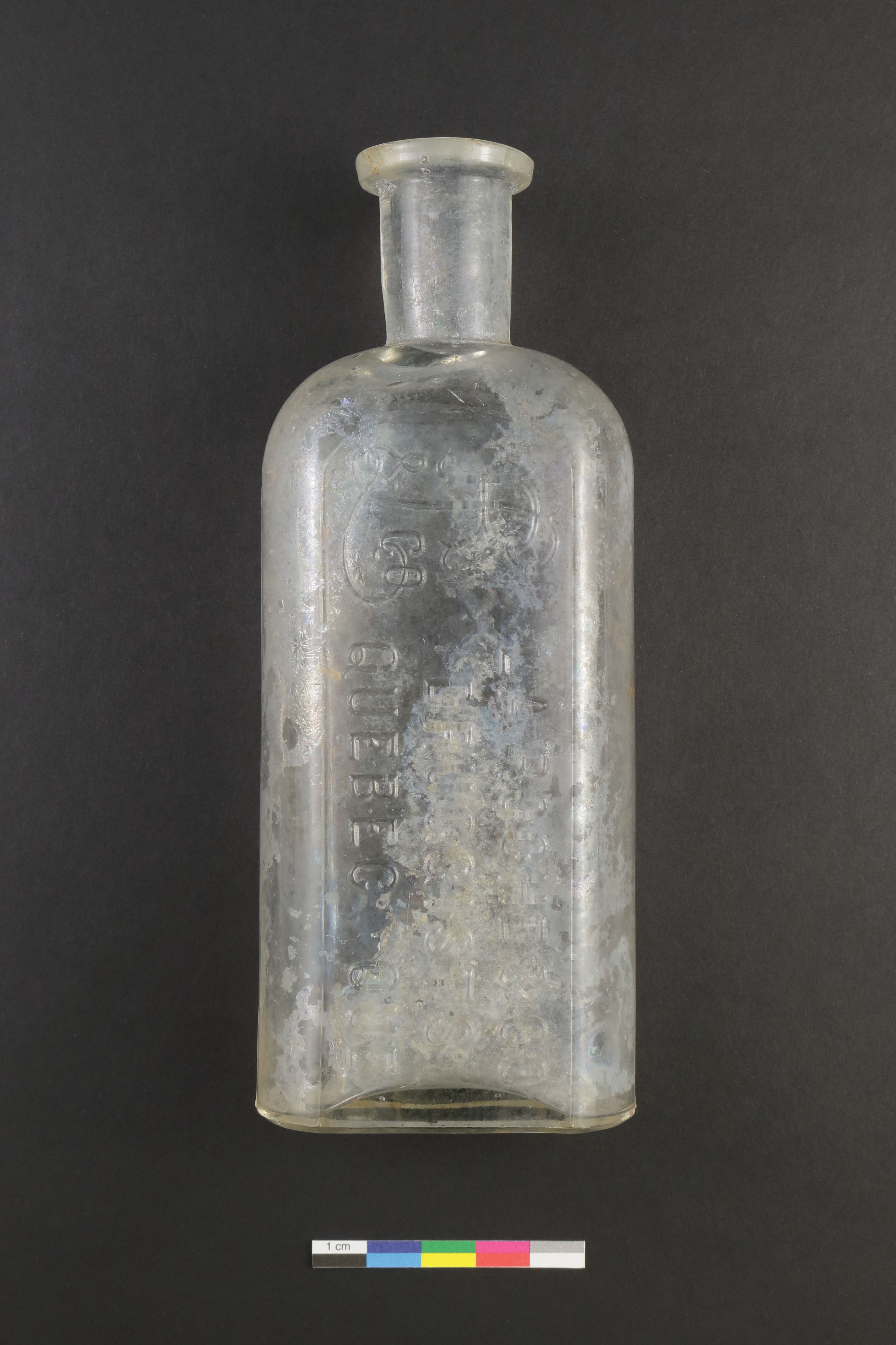 La bouteille d'apothicaire est un récipient à usage pharmaceutique. L'objet en verre incolore, fabriqué vers la fin du XIXe siècle, est entier. De forme ovale, la bouteille est de type « Philadelphie » et présente un col cylindrique ainsi qu'une lèvre de type pharmaceutique. Elle porte des marques d'évents sur les épaules et le corps et des inscriptions sont moulées sur le corps et sous le fond. La bouteille mesure 17 cm de hauteur, 6,5 cm de largeur et 4,1 cm de profondeur.