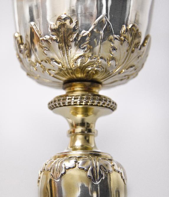 Ce vase sacré est une coupe sur pied mesurant 24,2 cm de haut et présentant une base d'une largeur de 13,7 cm. Le calice est composé de quatre parties indépendantes : le pied, la tige, la fausse coupe et la coupe. Le pied circulaire au dessus laissé uni - seule une fine croix y est gravée - est soudé sur une collerette au motif de cordon qui surplombe une frise de feuilles d'acanthe ajourée, rapportée et soudée à une bâte. Deux collerettes au motif de cordon ornent la tige qui présente un noeud ovoïde décoré d'un motif de feuilles de vigne soudées et rapportées aux extrémités de celui-ci. La coupe laissée unie selon l'usage repose sur une fausse coupe formée d'une frise de feuilles d'acanthe et de feuilles d'eau.
