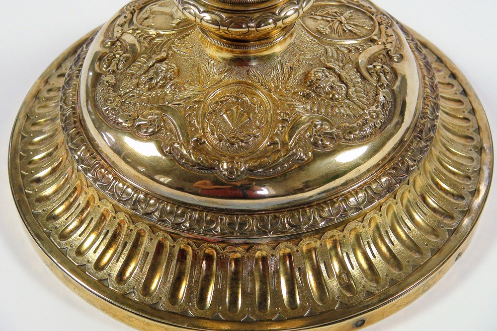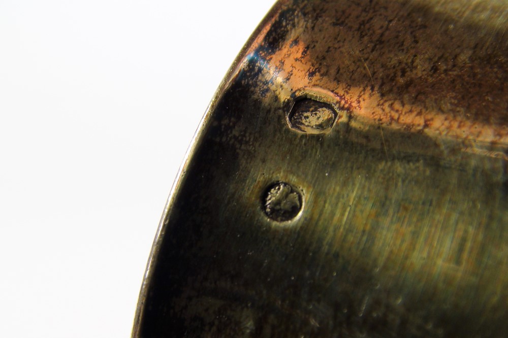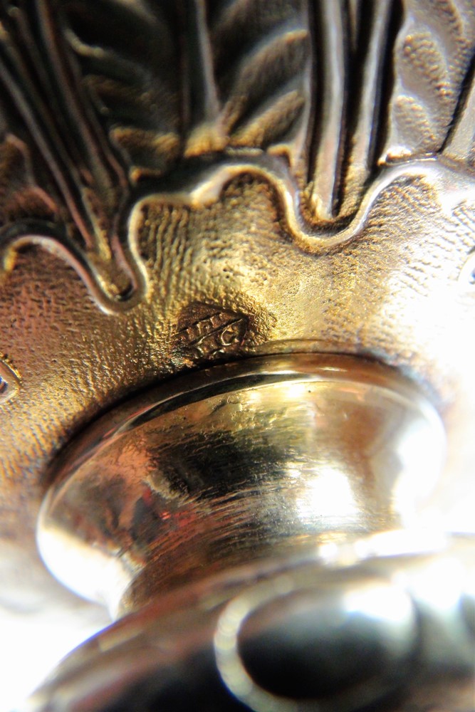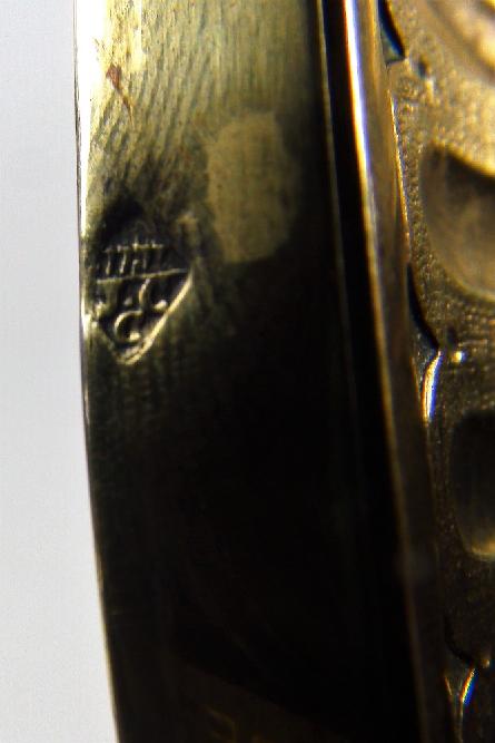 - Sur le rebord du pied : J C / C sous le tétragramme (?), dans un losange vertical