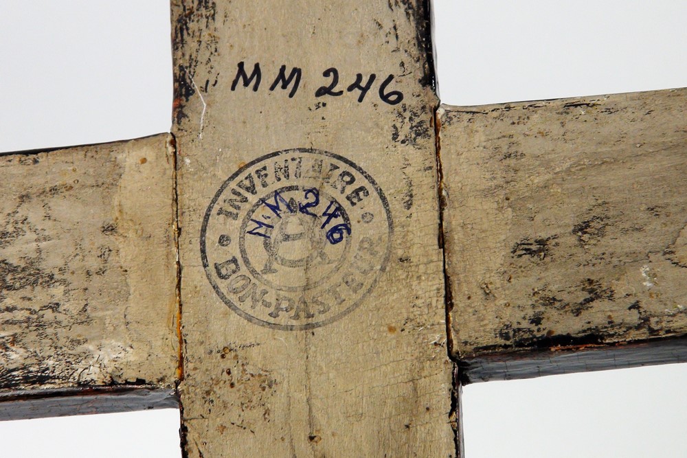 Haut : INRI. Derrière : Crucifix qui / servait dans les / processions re- / ligieuses, dès / l'origine de la / paroisse St-Lau- / rent, Ile D'Or- / léans / Mr le Cure / U : East en / fit don à / Notre Rde Mère / Mère M. du Carmel / Supre Génle / le 28 octobre, / - 1915 -. Derrière : INVENTAIRE BON-PASTEUR / OA / MM246
