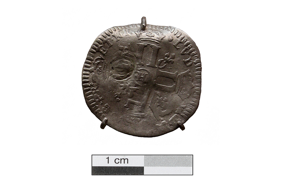 La monnaie, fabriquée en France au XVIe siècle, est un objet lié au commerce. Ce disque circulaire plat en billon mesure 2,3 cm de diamètre. L'avers de la pièce présente une croix et une fleur de lis dans un cartouche ovale, alors que le revers affiche l'écu de France.