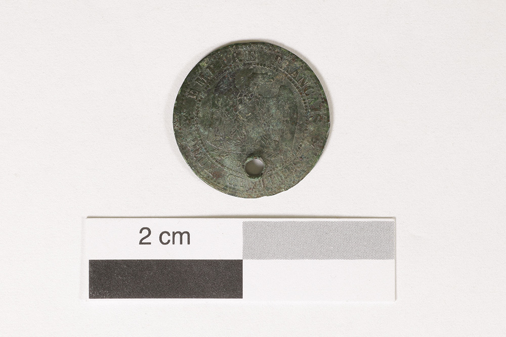 La monnaie, frappée en 1856, est un objet lié au commerce. Ce disque circulaire plat en bronze mesure 2 cm de diamètre. L'avers de la pièce présente le buste de Napoléon Ier, alors que le revers affiche un aigle aux ailes déployées.