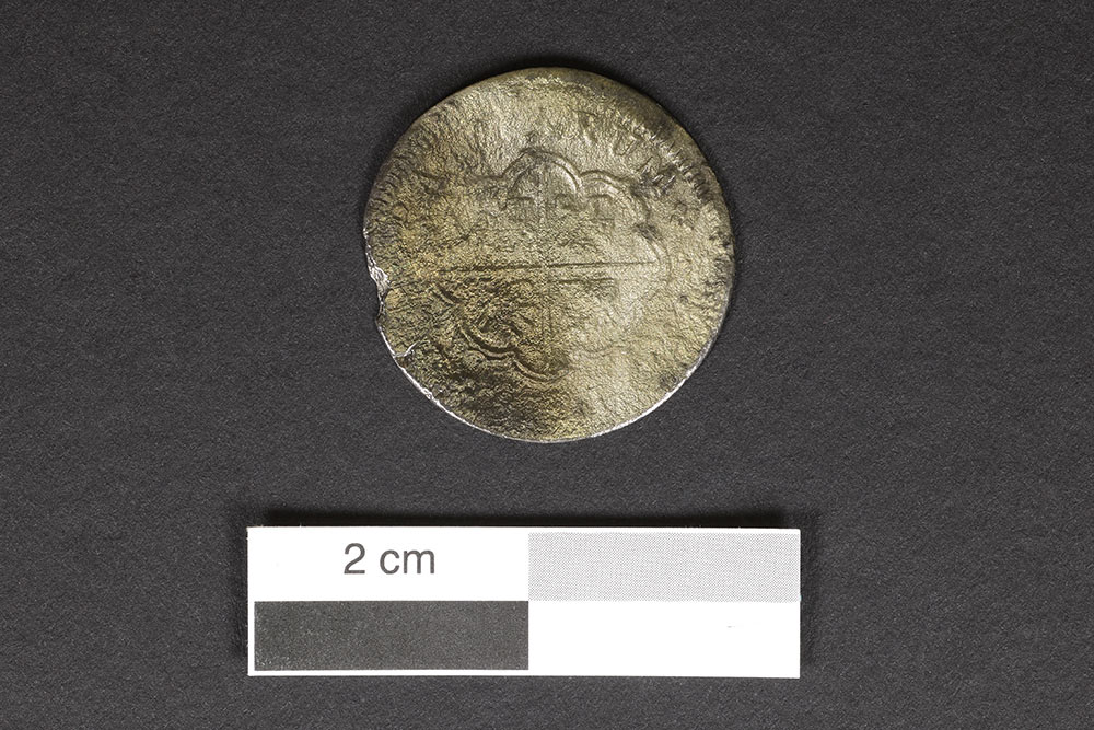 La monnaie, frappée en 1719, est un objet lié au commerce. Ce disque circulaire plat en argent mesure 2,75 cm de diamètre. L'avers de la pièce présente l'écu des Habsbourg, alors que le revers affiche une croix de Jérusalem flanquée des armes de Castille et de Léon.