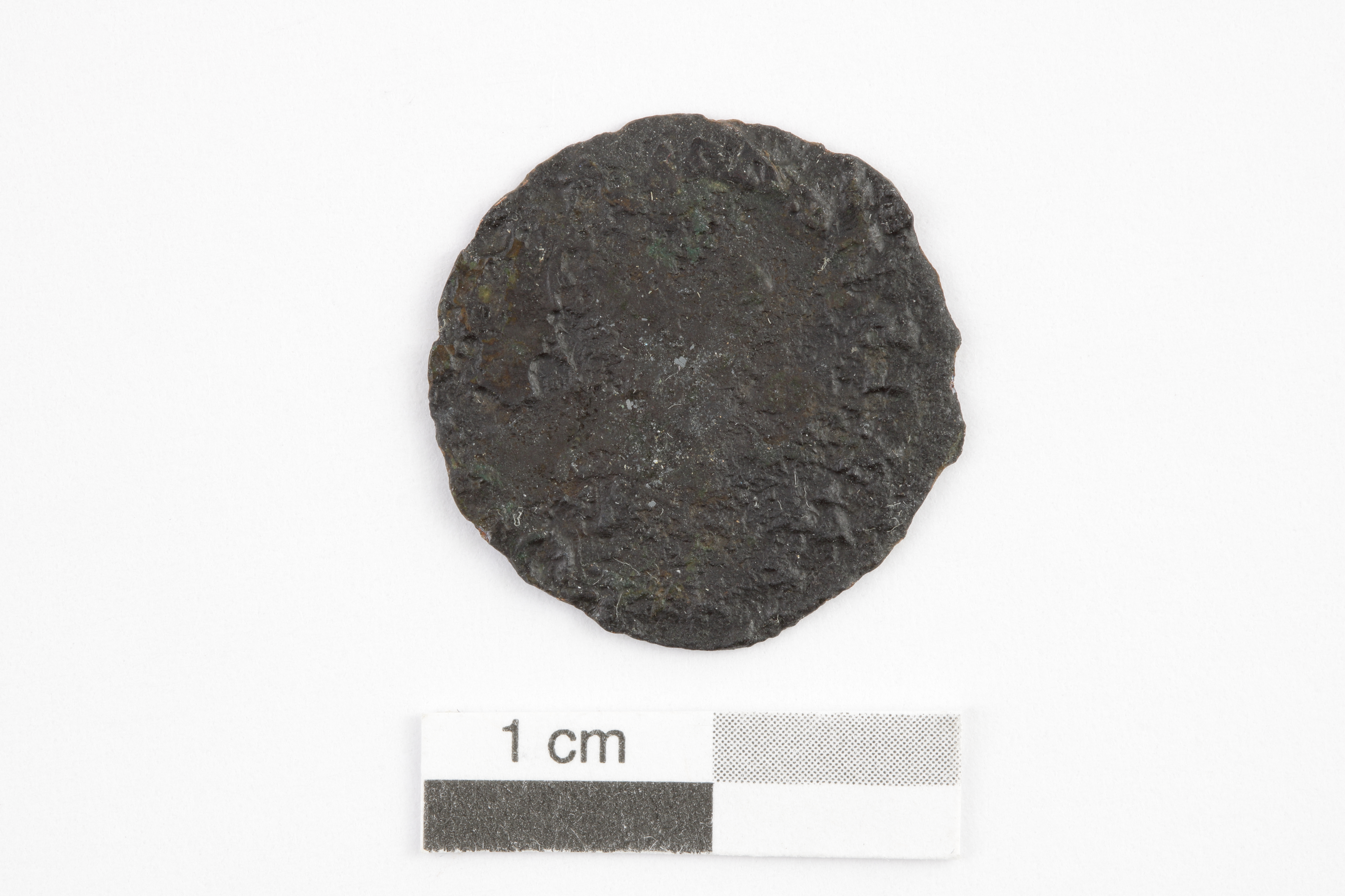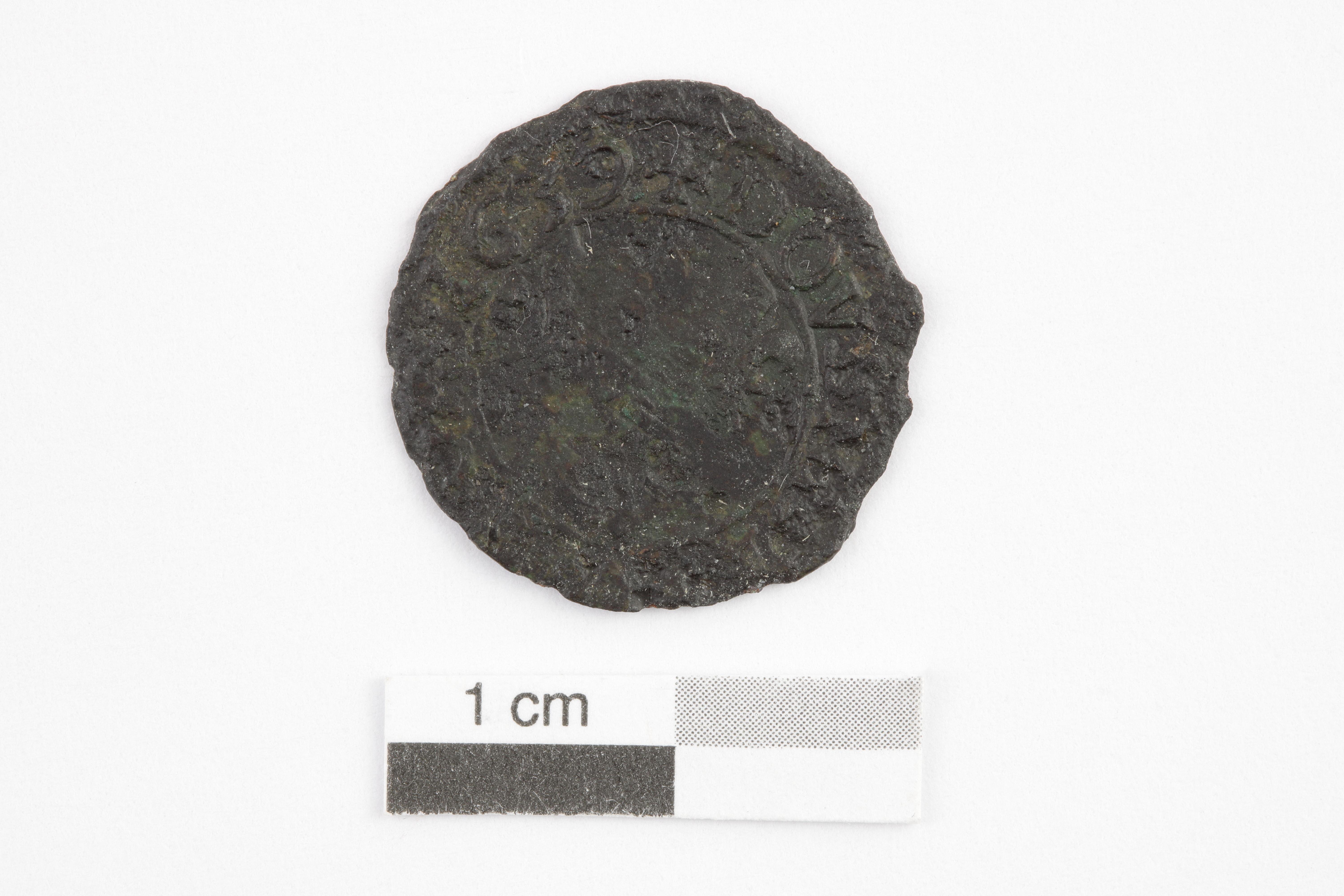 La monnaie, frappée en 1639, est un objet lié au commerce. Ce disque circulaire plat en cuivre mesure 1,9 cm de diamètre. Le revers de la pièce présente trois fleurs de lys dans un cercle.