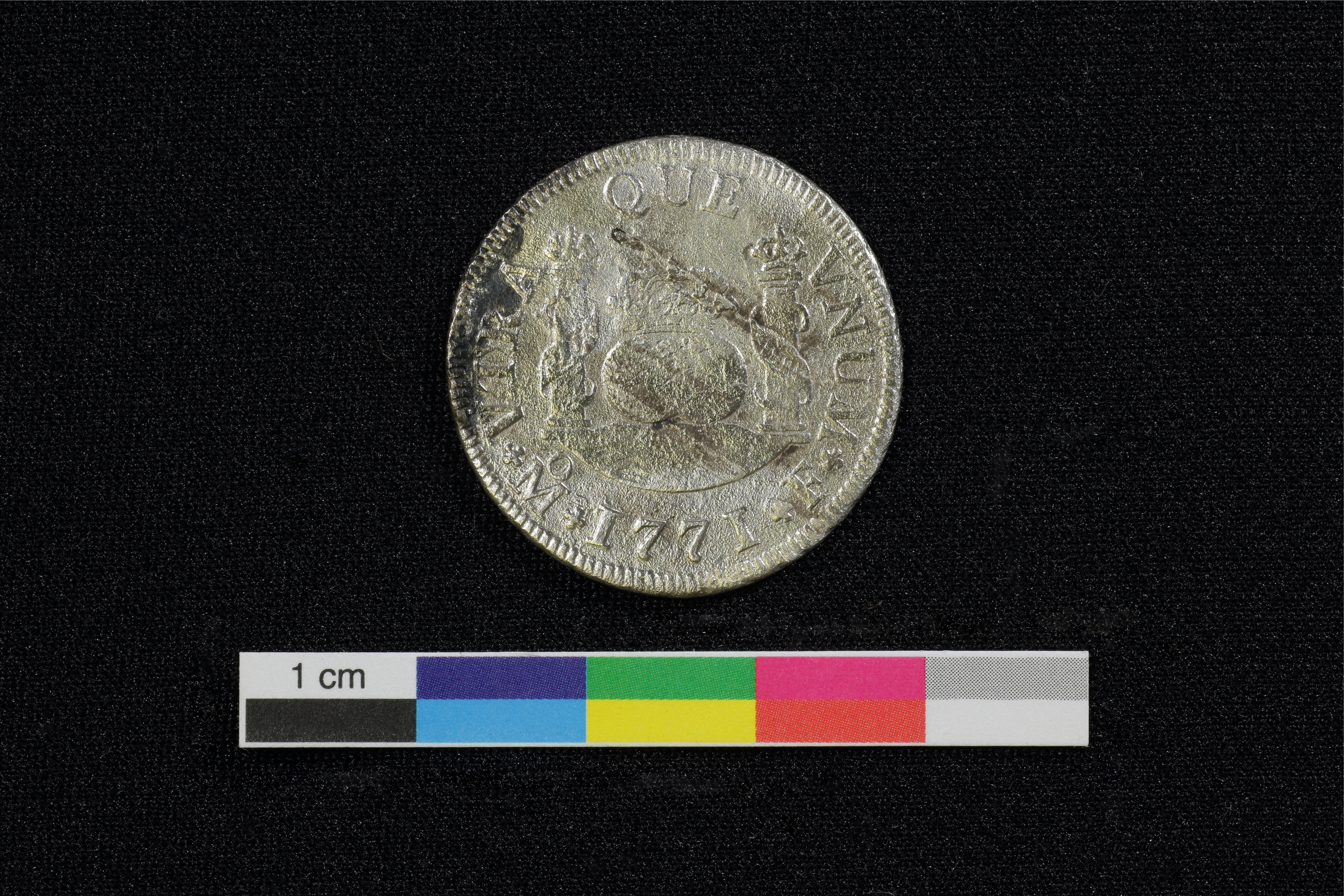 Cette pièce constitue l'une des très rares monnaies hispano-américaines figurant parmi les collections archéologiques québécoises. La plupart des monnaies de type « à colonnes » conservées au Québec sont rattachées à la seconde variante, avec l'écu entre les colonnes, tandis que cette pièce représente le premier type, avec les deux vues du monde.