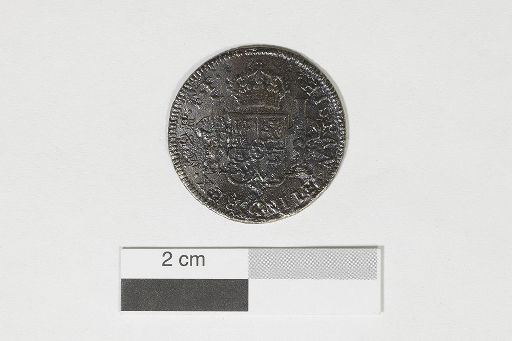 La monnaie, frappée en 1781, est un objet lié au commerce. Ce disque circulaire plat en argent mesure 2,75 cm de diamètre. L'avers de la pièce présente le buste de Charles III, alors que le revers affiche un écu couronné aux armes de Castille et de Léon flanqué des colonnes d'Hercule.