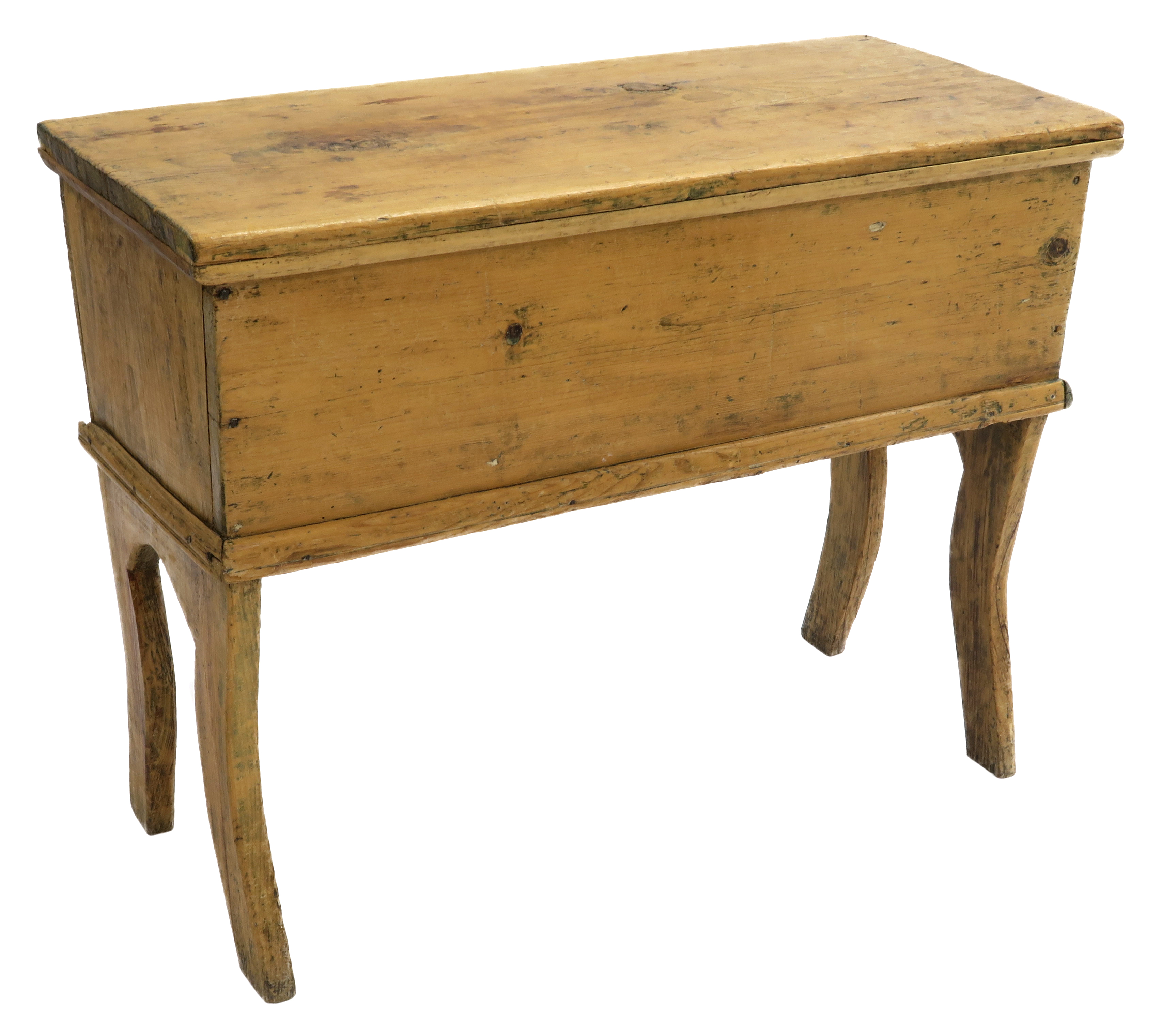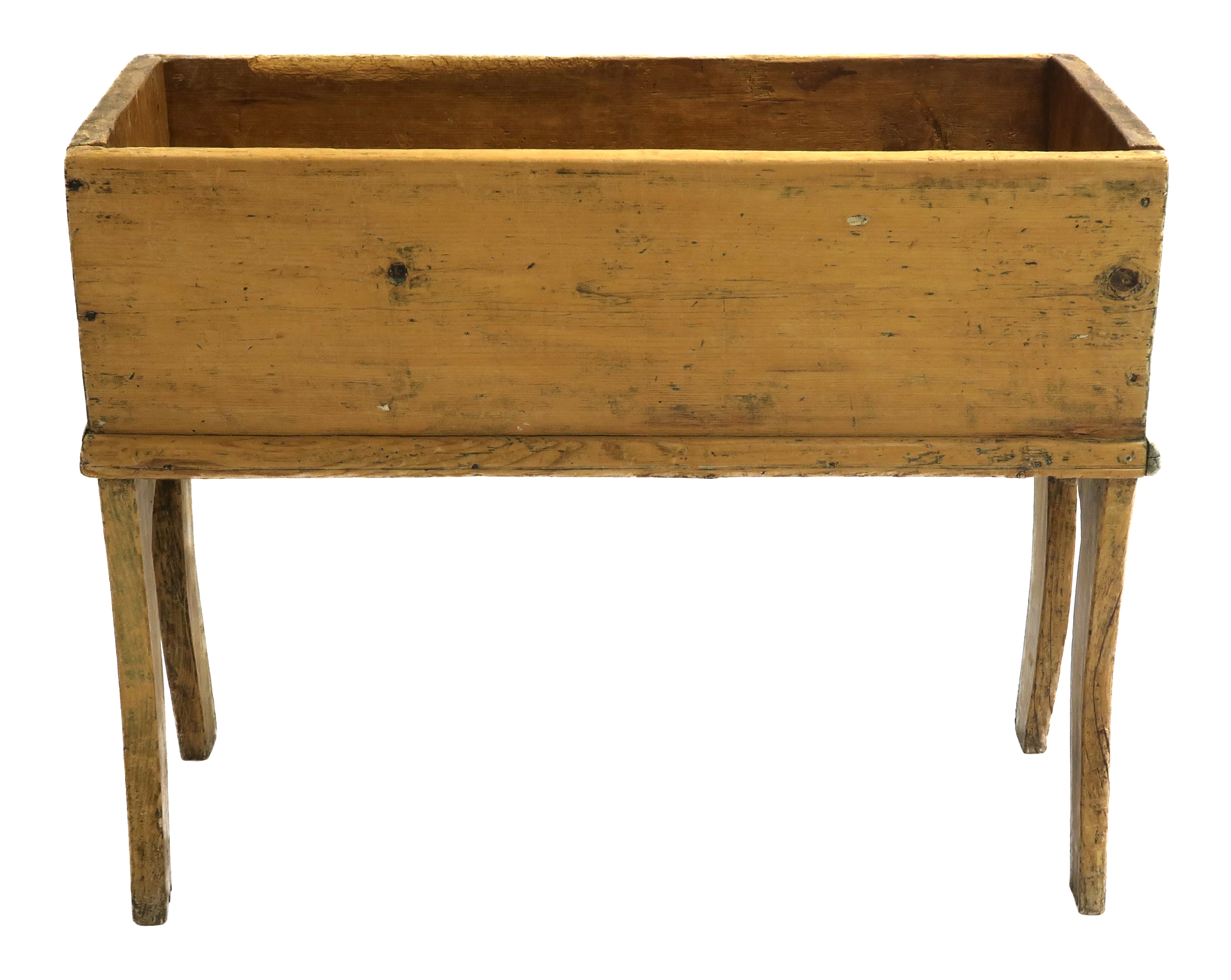 Huche à pain ou pétrin en pin du 19e siècle, avec couvercle. Elle mesure 76 cm de hauteur, 96,8 cm de longueur et 45,4 cm de largeur. Le corps est constitué de quatre larges planches d'une seule coupe, assemblées à angle droit et clouées à l'aide de clous forgés. Il est juché sur un piétement chantourné dont le galbe s'inspire du style Empire tel qu'il se pratiquait aux États-Unis. Le bas du corps est orné d'une moulure sur trois faces, soit le devant et les deux côtés. Ces trois moulures ne sont pas identiques, celle de gauche étant davantage travaillée, celle du centre n'étant ornée que d'une seule rainure et celle de droite ne présentant aucune ornementation. Elles sont toutes trois clouées au corps avec des clous forgés. La paroi interne du couvercle est bornée sur trois côtés d'un quart-de-rond destiné à maintenir en place le couvercle sur la huche. Le quart-de-rond de gauche, plus récent, est cloué au couvercle avec des clous à tête et corps ronds, les autres le sont avec des clous tranchés. Le dos de la huche, le dessous et l'intérieur sont laissés au bois naturel.