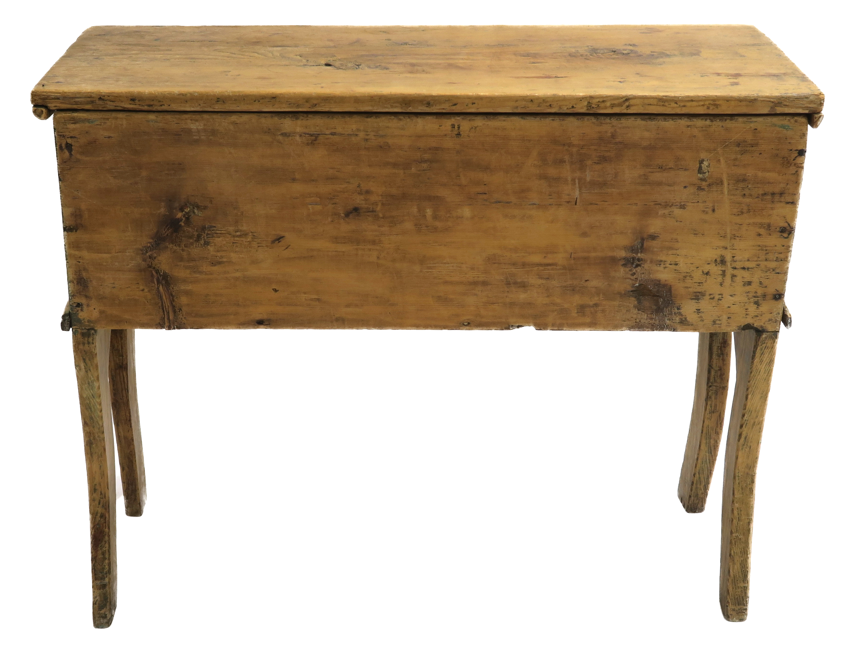 L'ensemble de la huche est patiné. L'intérieur est vermoulu, en particulier le fond et le bas des côtés. La forme larvaire d'un insecte aurait entamé le bois en se nourrissant des restes de farine. La huche présente aussi des traces d'usure possiblement liées à son utilisation, sur le chant des deux bords de son côté gauche. Le couvercle est marqué de cernes de verres et autres récipients.