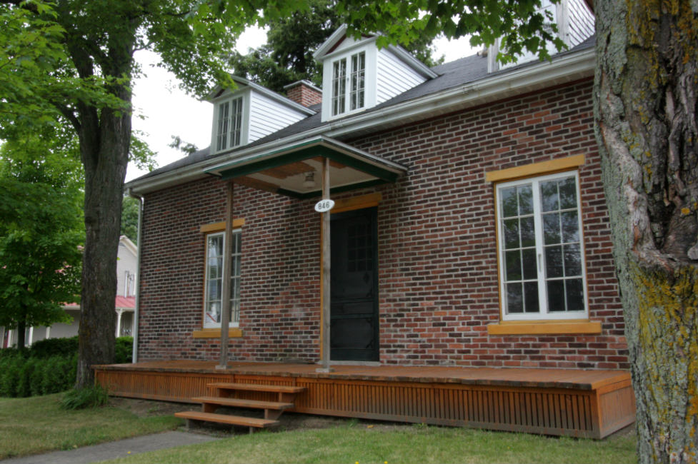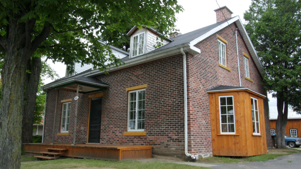 - ses matériaux, dont le parement en brique rouge, les deux cheminées en brique et les fondations en pierre équarrie;