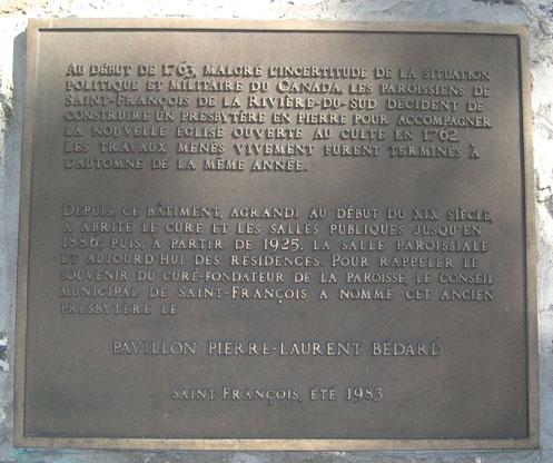 Depuis, ce bâtiment, agrandi au début du XIX siècle, a abrité le curé et les salles publiques jusqu'en 1886, puis, à partir de 1925, la salle paroissiale et aujourd'hui des résidences. Pour rappeler le souvenir du curé-fondateur de la paroisse, le conseil municipal de Saint-François a nommé cet ancien presbytère le Pavillon Pierre-Laurent Bédard