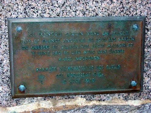 Ici, François Gaulin venu du Perche, pays de France, ancêtre de tous les Gaulin du Québec et d'Amérique bâtit maison et y tint feu et lieu avec son épouse Marie Rocheron