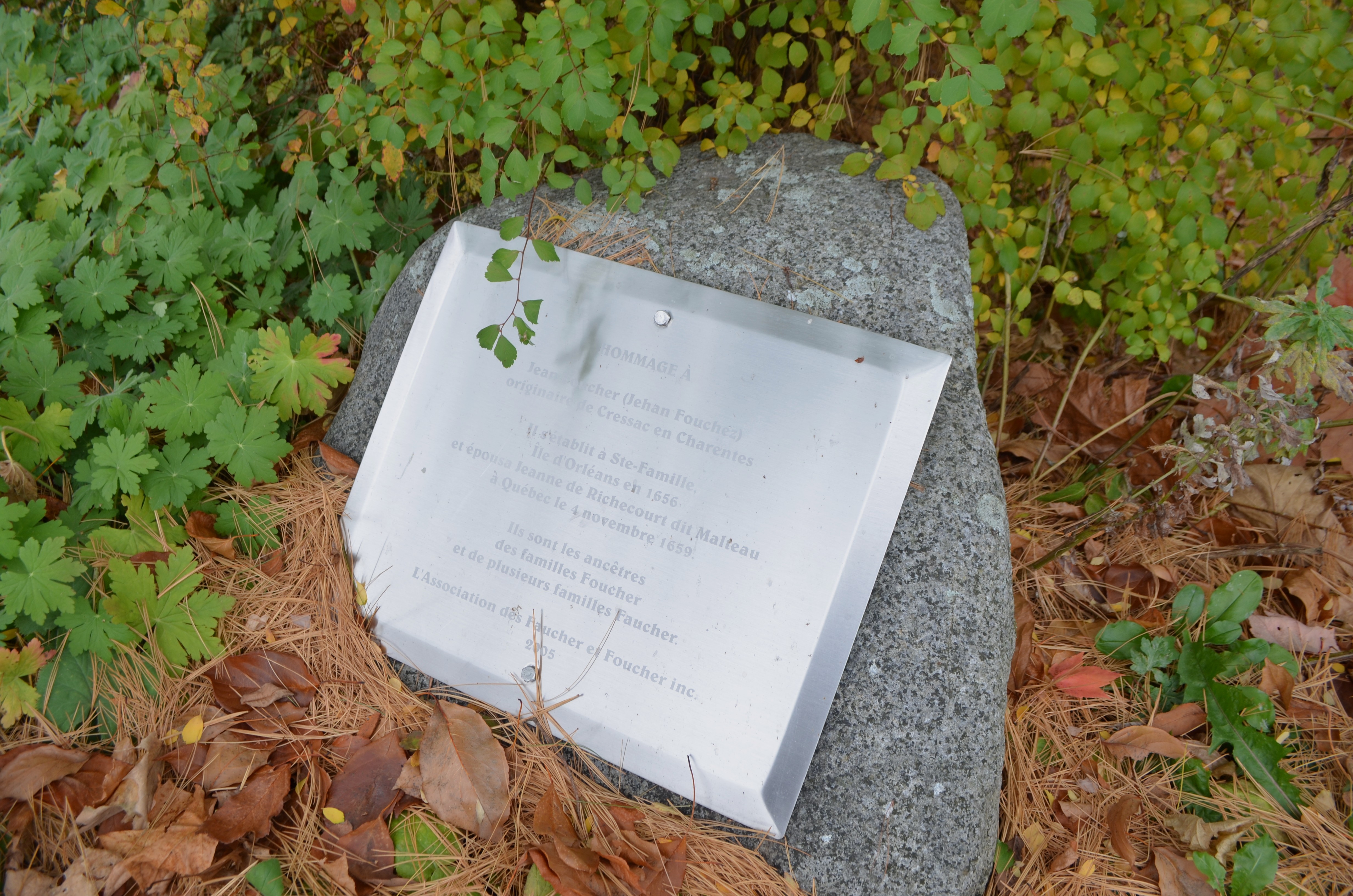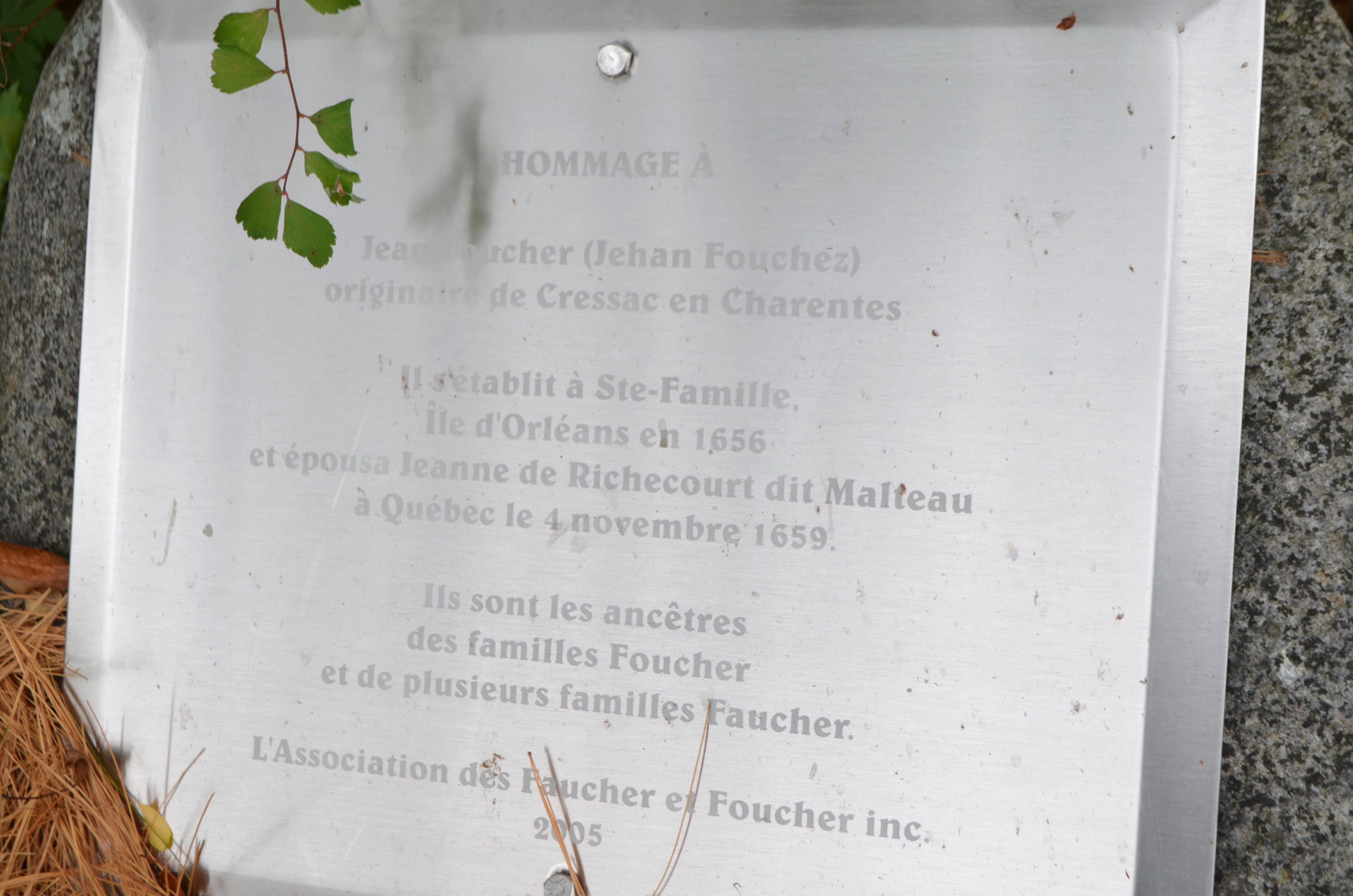 La plaque, posée et entretenue par la Fondation François-Lamy, rend hommage à l'ancêtre Jean Foucher et à son épouse, Jeanne de Richecourt dite Malteau.