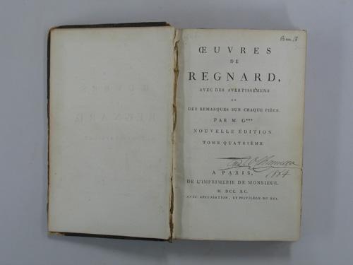 Livre (Oeuvres de Regnard : avec des avestissemens [sic] et des remarques sur chaque pièce par M. G. (Tome IV))