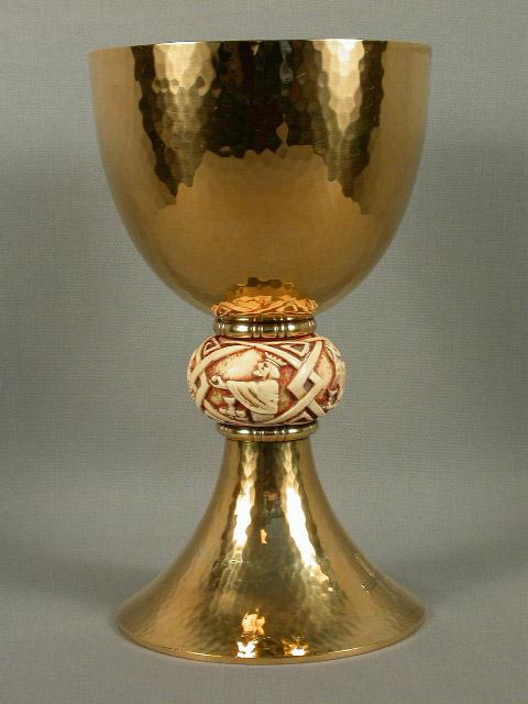 Calice sur base circulaire, ornée d'un simple croix. Noeud en ivoire sculpté représentant six scènes bibliques. Coupe unie.