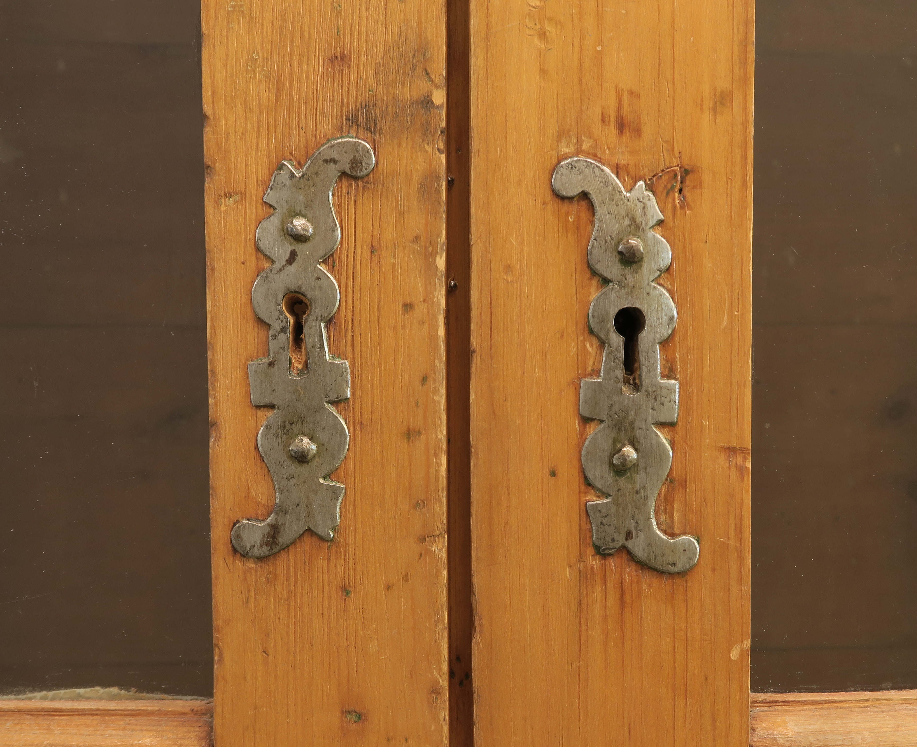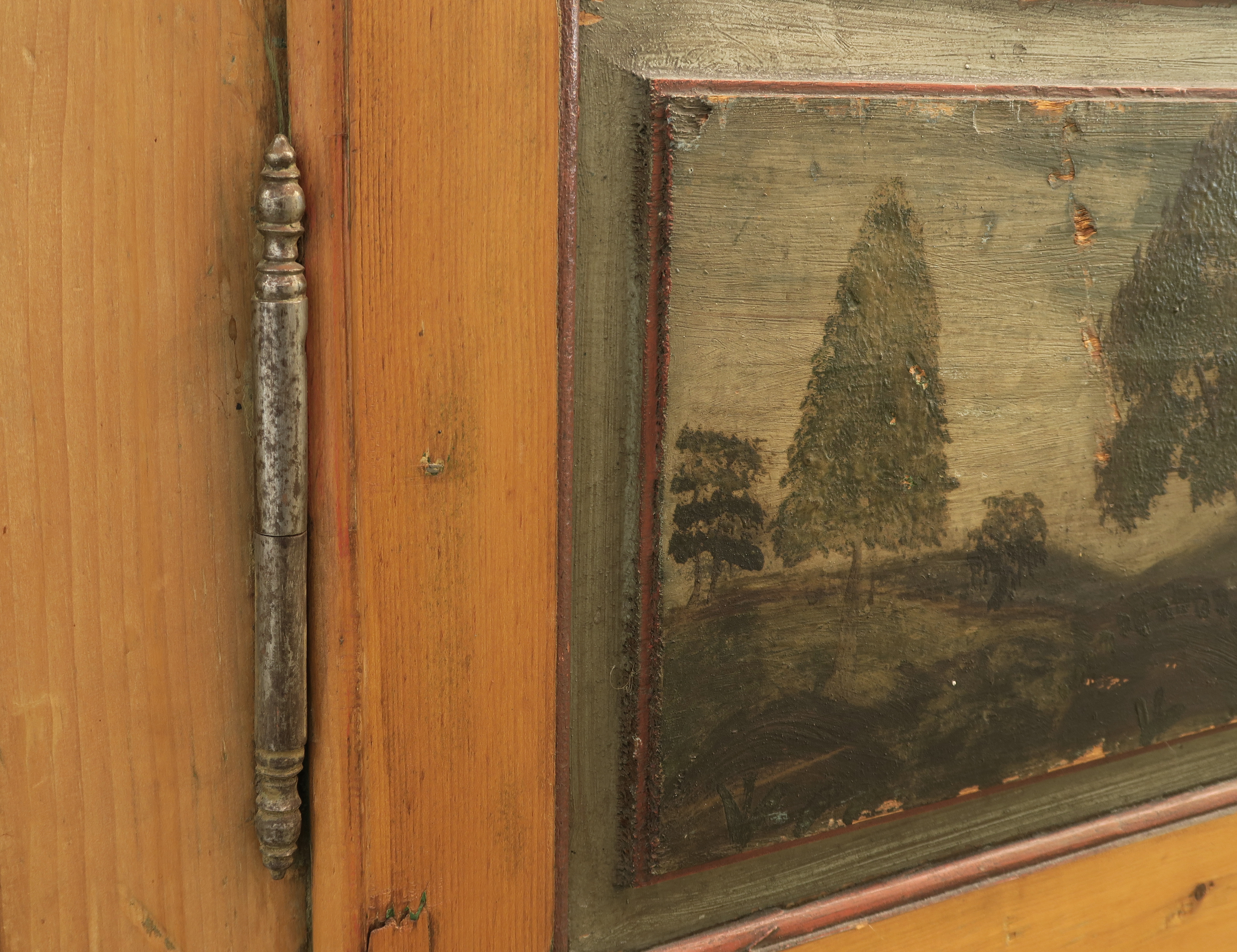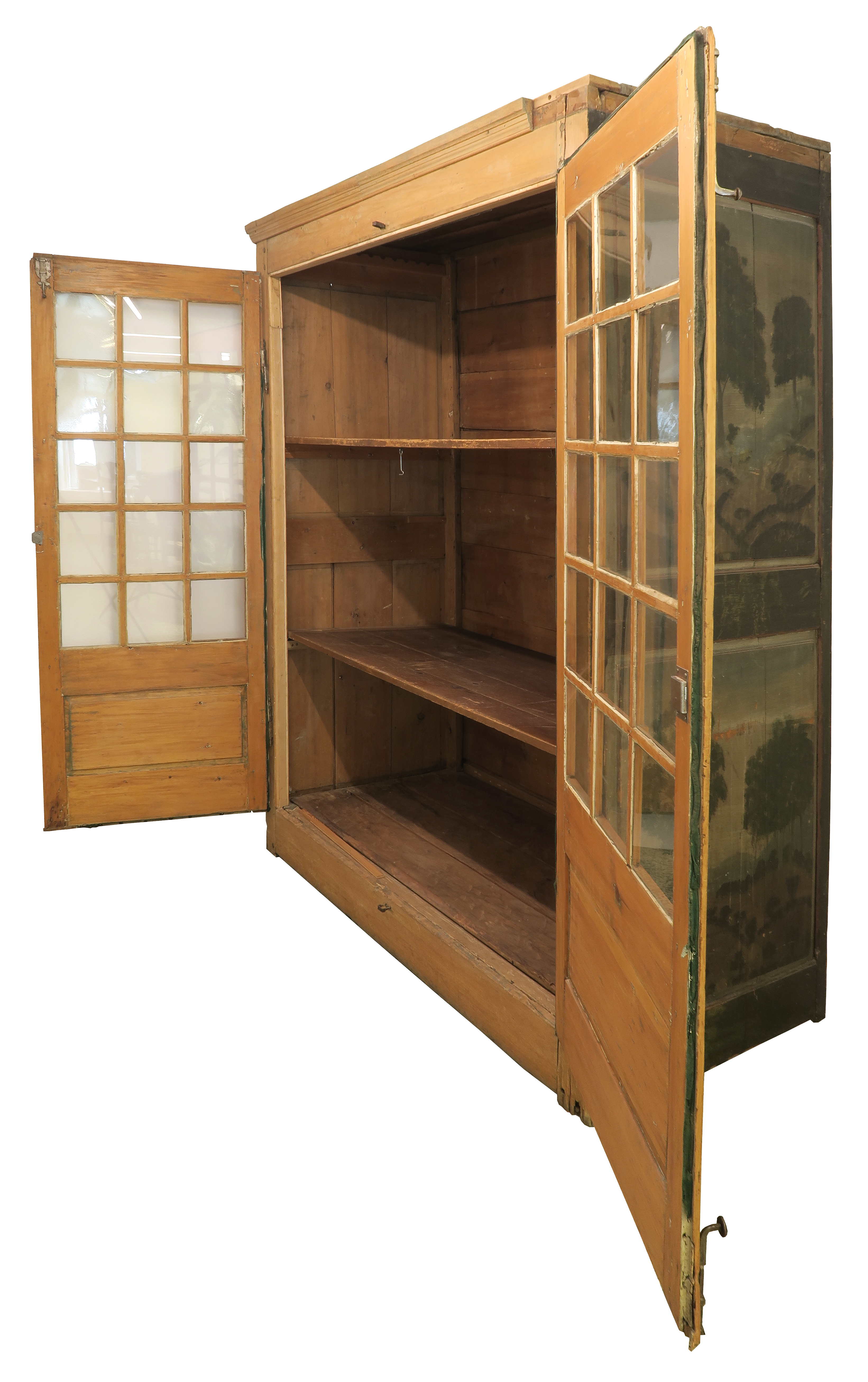Cette armoire haute à vitres soufflées a été fabriquée en Nouvelle-France entre 1650 et 1687. L'armoire d'aspect rustique mesure 225 cm en hauteur, 172 cm en largeur et 84,5 cm en profondeur. Elle est composée de deux vantaux à vingt petits carreaux de verre et de panneaux peints sur les deux battants de la façade et sur les côtés. Les oeuvres peintes ont été réalisées par soeur Marie-Madeleine Maufils de Saint-Louis vers la fin du 17e siècle; des paysages bucoliques y sont représentés. Le bois entourant les oeuvres peintes du côté droit est de couleur vert foncé; le reste est au bois naturel. Deux entrées de serrure en fer ornent l'armoire en pin blanc et deux verrous en fer, situés dans le haut et le bas du vantail droit, maintiennent les deux portes fermées. Une simple corniche tirée d'un même morceau de bois couronne partiellement le meuble. Le quadrillage des fenêtres est assemblé à mi-bois, avec des cabochons fixés en façade à l'aide chevillettes sur chaque croisement. Les carreaux de verre sont fixés dans la feuillure au dos des vantaux à l'aide de mastic. Plusieurs carreaux ont été changés. Les carreaux de verre d'origine ont été fabriqués par disque centrifuge. Les planches du fond de l'armoire étaient recouvertes de prélart. Après une tentative pour le retirer, les planches ont été tout simplement retournées pour le dissimuler. Il est visible sous l'armoire. La surface des planches maintenant visible à l'intérieur du meuble est très grossière, couverte de traces d'herminette, sans travail de rabot pour les rendre lisses. L'espace intérieur est divisé par deux tablettes. Les tasseaux de support de tablette sont récents et il n'y a pas d'entailles dans les montants pour accueillir ces tasseaux, comme cela était l'usage pour les armoires de cette époque, ce qui laisse penser que cette armoire ne possédait peut-être pas de tablettes à l'origine et qu'elle pouvait servir originellement de penderie. Un verrou vertical plat français, à tête de persil, est fixé à l'intérieur du vantail gauche. Il est biseauté, avec un renflement qui l'empêche de glisser. Les verrous extérieurs ne sont pas d'origine. Il s'agit de verrous de fenêtre récupérés. Celui du bas est de facture française, celui du haut est de facture anglaise. Il s'en fabriquait encore en 1810. Les entrées de serrure sont d'inspiration française et le trou ne correspond pas à la serrure, qui est anglaise. L'entrée de serrure du vantail gauche est décorative. Les deux entrées de serrure sont inversées, par soucis de symétrie, et ont un fini limé. Les vantaux pivotent sur des paumelles à vase forgées, d'origine. Une tôle métallique est fixée sur l'intérieur de la traverse supérieure, ainsi que sur le coin inférieur du cadre de la porte, et une moulure de bois a été fixée sur le cadre intérieur, probablement pour augmenter l'étanchéité et pour empêcher le passage des rongeurs.