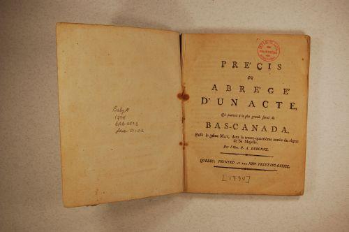 Livre (Précis ou Abrégé d'un acte, qui pourvoit à la plus grande sureté [sic] du Bas-Canada , passé le 30me [i.e. 31ème] may, dans la trente-quatriéme [sic] année du règne de Sa Majesté)