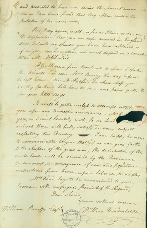 Document (Lettre de Wm Vondenvelden à Wm Berczy)