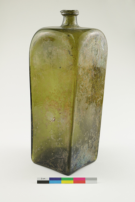 Cette bouteille à boisson alcoolisée de forme carrée à bague large a été mise au jour sur le site de la maison Perthuis, dans le secteur de Place-Royale à Québec. D'après la forme de la bouteille et du goulot, l'objet aurait été fabriqué durant le deuxième quart du XVIIIe siècle aux Pays-Bas, en Allemagne ou en Flandres, soit la Belgique actuelle.