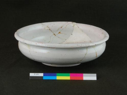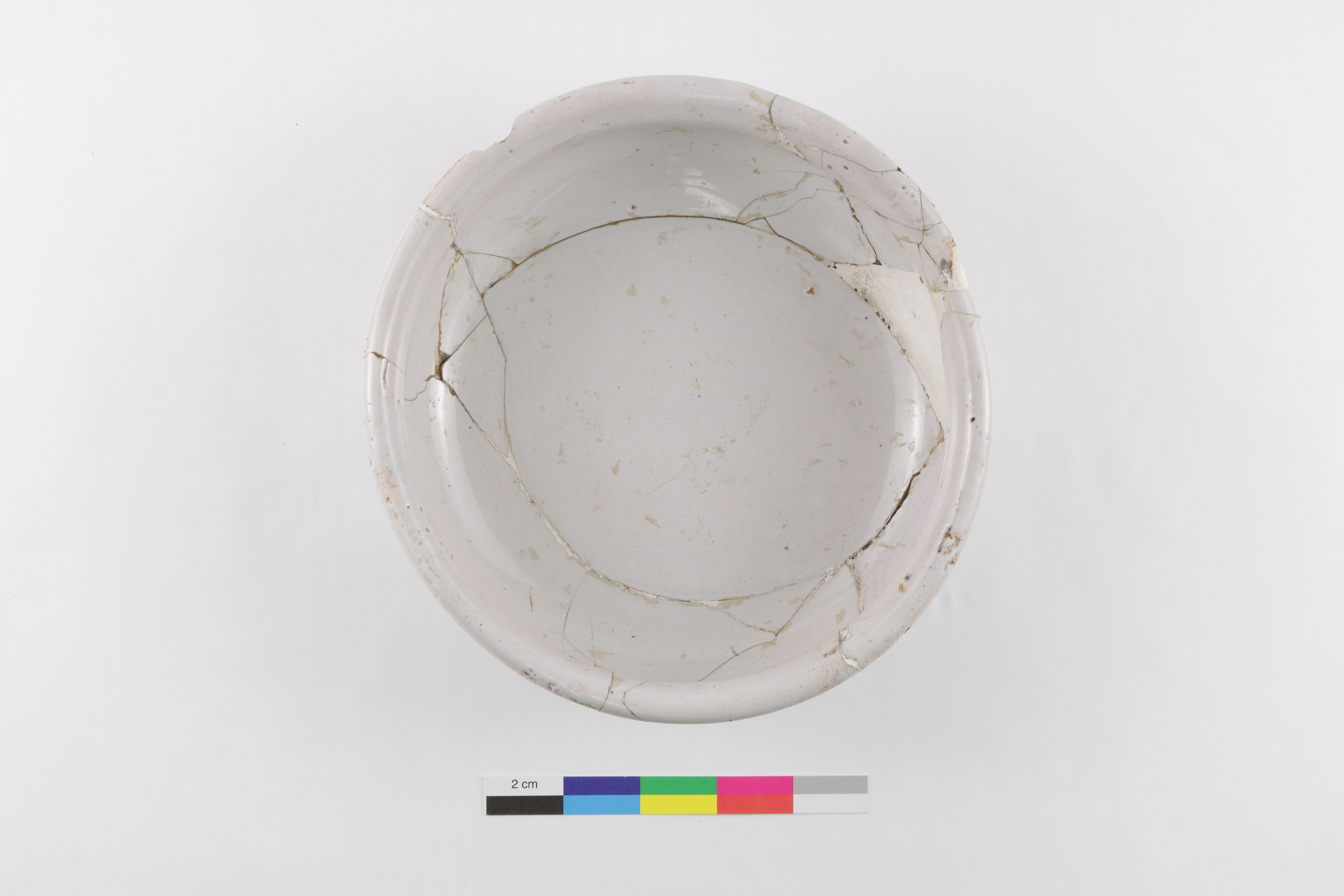 Le pot à confiture en faïence blanche de grand feu est lié au service et à la consommation des aliments. L'objet, fabriqué vers 1730, est complet et fragmenté. L'artéfact mesure 15 cm de diamètre et 5,2 cm de hauteur.
