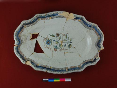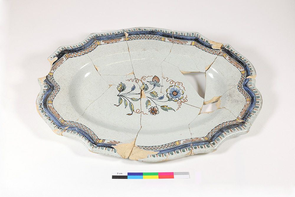 Le plat en faïence est associé à un contexte archéologique des années 1753 à 1800. L'objet au décor rocaille peint en polychromie rappelle les productions françaises de Rouen du deuxième tiers du XVIIIe siècle.