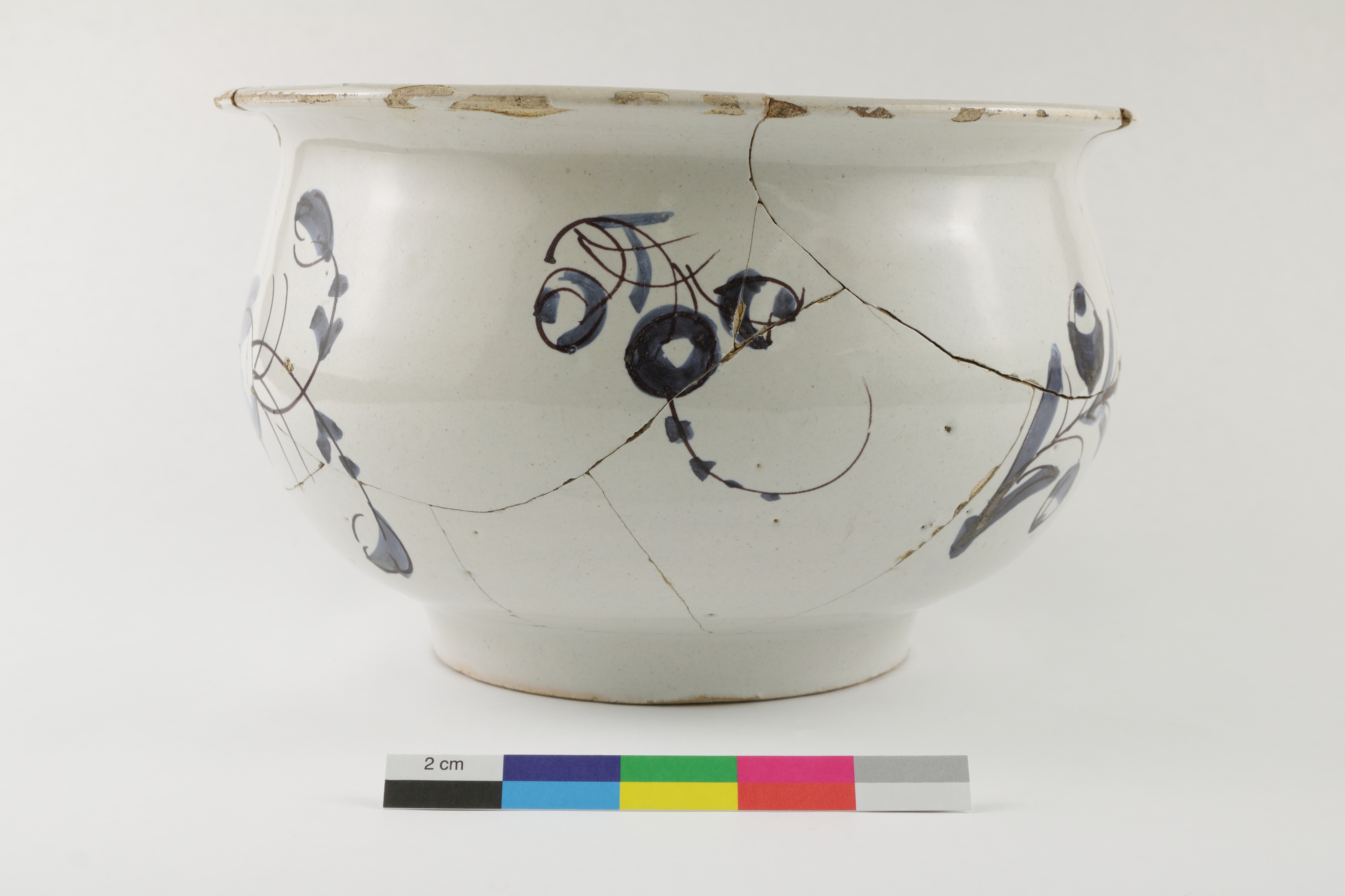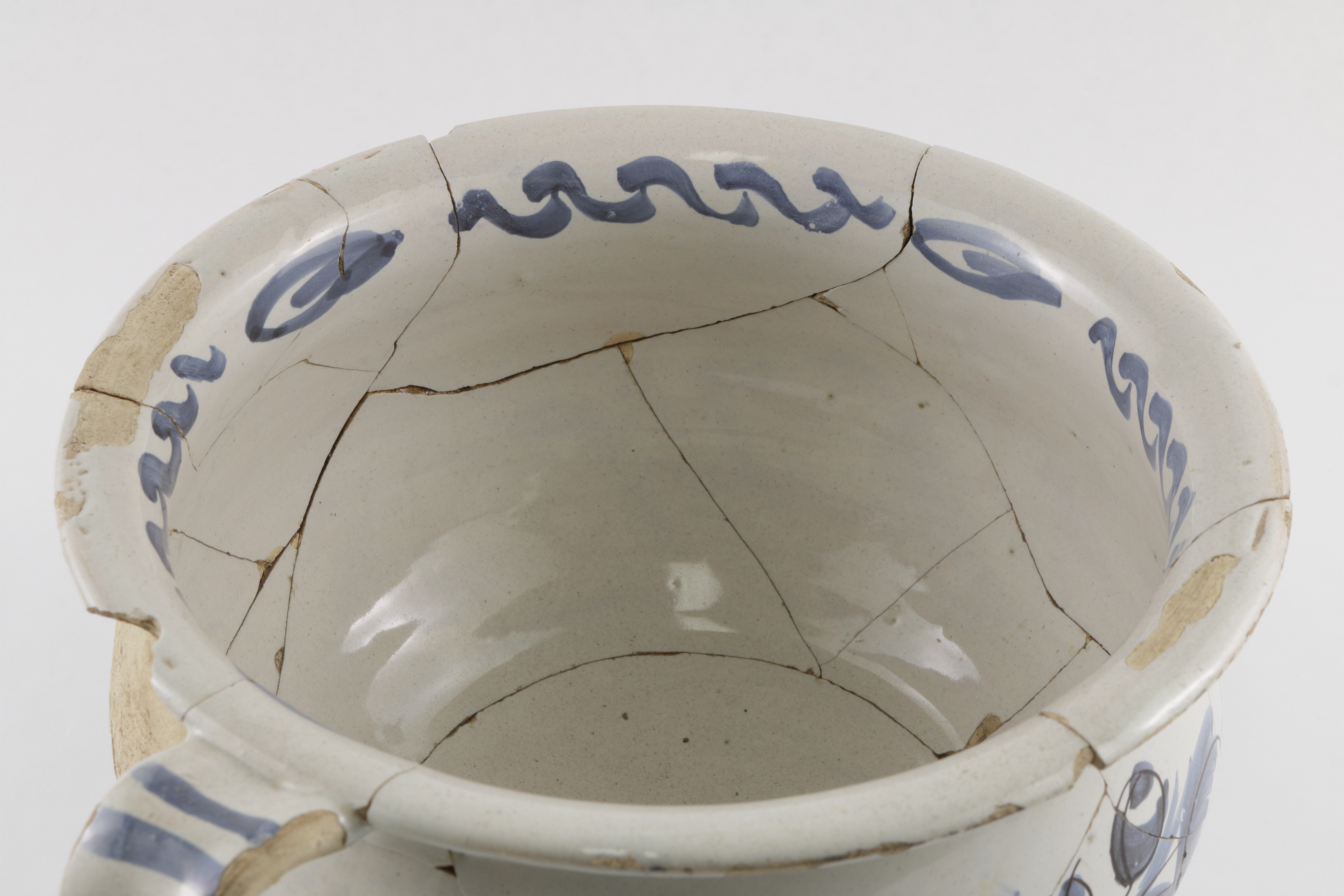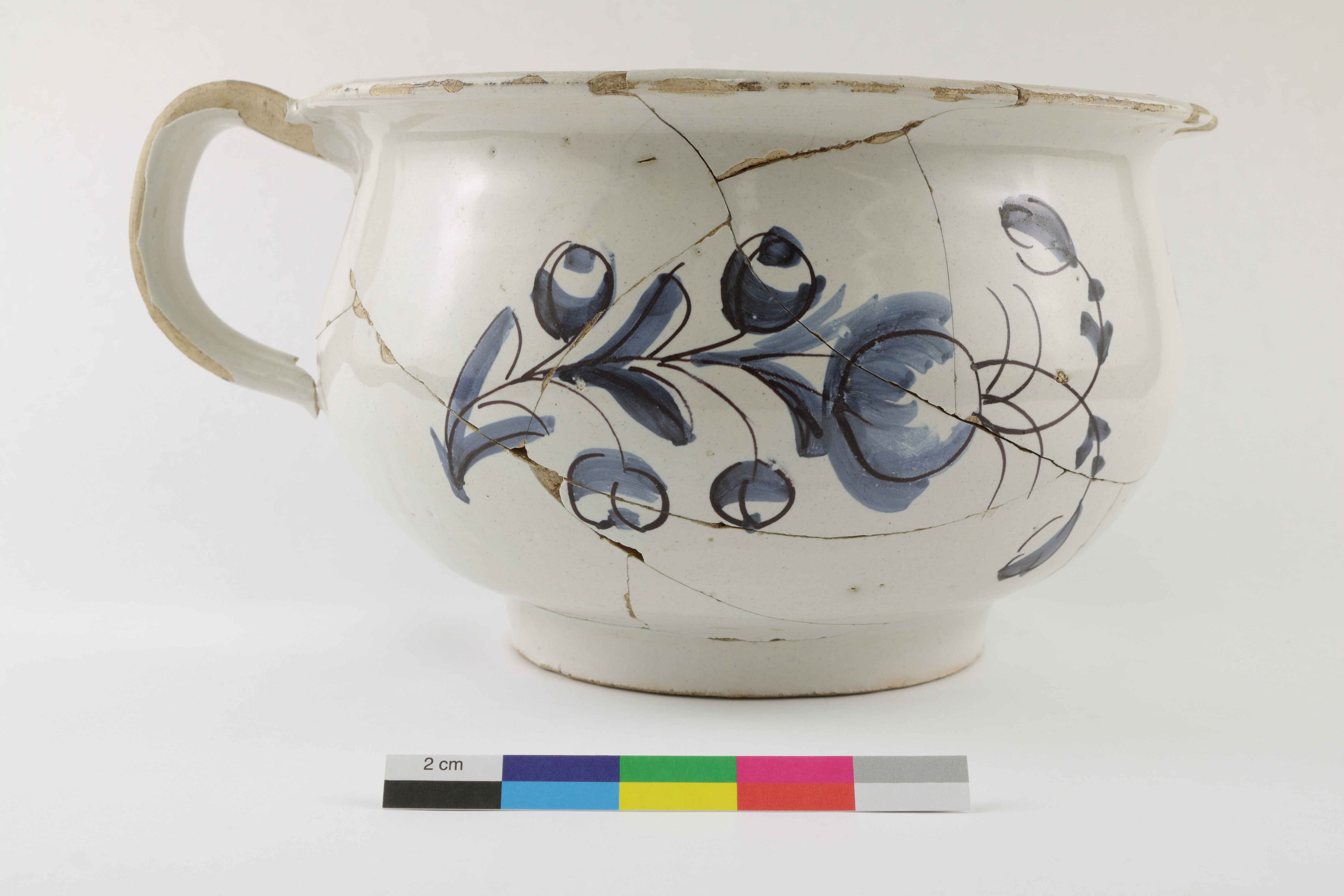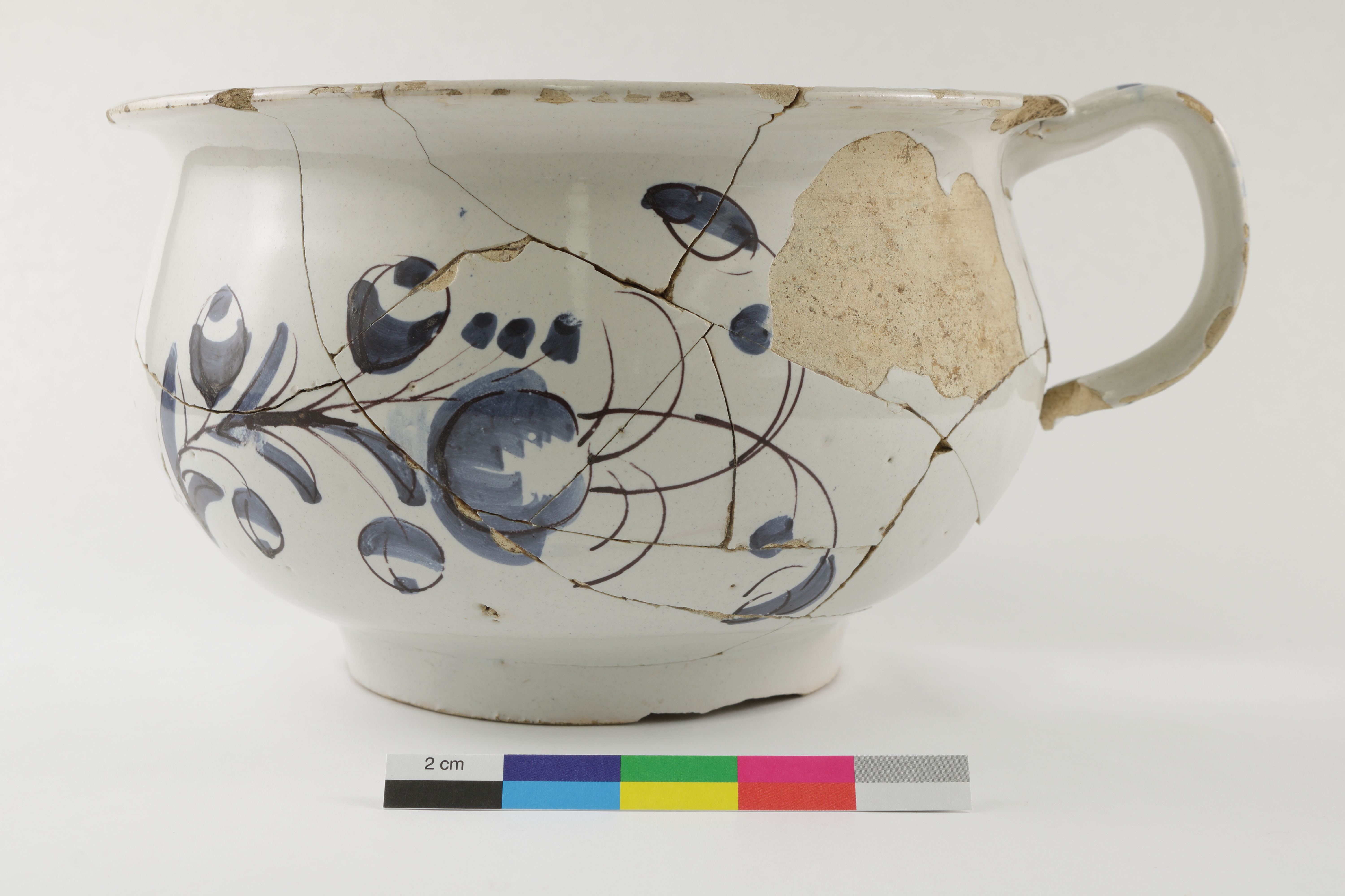 Le pot de chambre en faïence blanche de grand feu est un récipient servant à recueillir les excréments. L'objet, fabriqué au XVIIIe siècle, est complet et fragmenté. L'artéfact est orné de décors peints en camaïeu bleu rehaussé de violet sur les deux parois et l'anse verticale. Il mesure 12,4 cm de hauteur et 20,2 cm de diamètre.