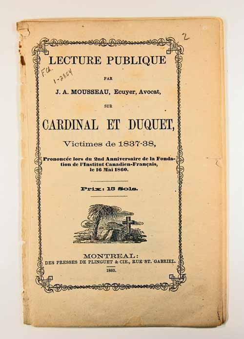 Brochure (Lecture publique par J.A. Mousseau, écuyer, avocat, sur Cardinal et Duquet, victimes de 37-38 : prononcée lors du 2nd anniversaire de la fondation de l'Institut canadien-français, le 16 mai 1860)