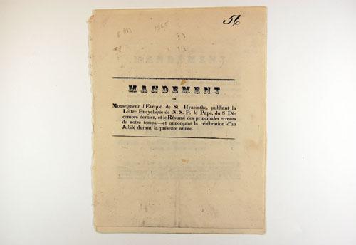 Brochure (Mandement de Monseigneur l'évêque de St. Hyacinthe, publiant la lettre encyclique de N.S.P. le pape, du 8 décembre dernier, et le résumé des principales erreurs de notre temps, et annonçant la célébration d'un jubilé durant la présente année)