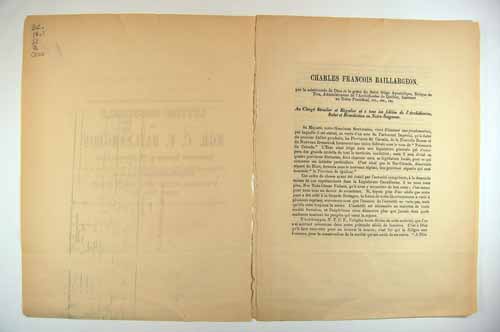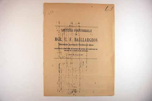 Brochure (Lettre pastorale de Mgr. C. F. Baillargeon, administrateur apostolique de l'archidiocèse de Québec, annonçant la division du diocèse de Québec, et l'érection du diocèse de S. Germain de Rimouski, Québec, 11 avril 1867)