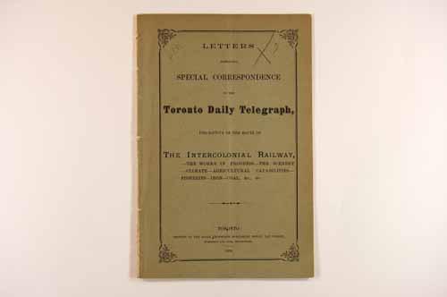 Brochure (Letters embracing special correspondence to the Toronto Daily Telegraph, descriptive of the route of Intercolonial Railway, the works in progress, the scenery, climate, agricultural capabilities, fisheries, iron, coal, &c., &c.)