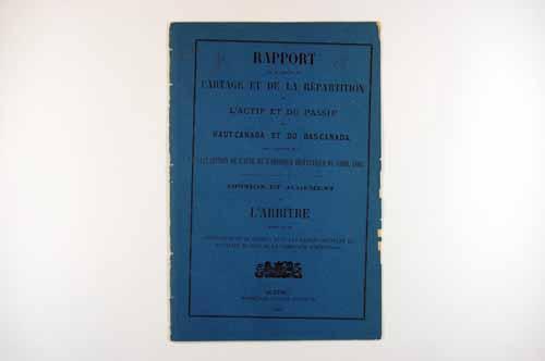 Brochure (Rapport sur la question du partage et de la répartition de l'actif et du passif du Haut-Canada et du Bas-Canada, sous l'autorité de la 142e section de l'Acte de l'Amérique britannique du Nord, 1867 : opinion et jugement de l'arbitre nommé par le gouvernement de Québec, avec les raisons motivant sa retraite du sein de la commission d'arbitrage)