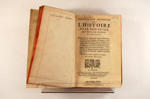 Livre (Chronologie septenaire de l'histoire de la paix entre les roys de France et d'Espagne : contenant les choses plus memorables aduenuës en France, Espagne, Allemagne, Italie, Angleterre, Escosse, Flandres, Hongrie, Pologne, Suece, Transsyluanie, [et] autres endroits de l'Europe: auec le succez aux Indes Orientales, Occidentales [et] Septentrionales, depuis le commencement de l'an 1598 iusques à la fin de l'an 1604 (Ex. I))