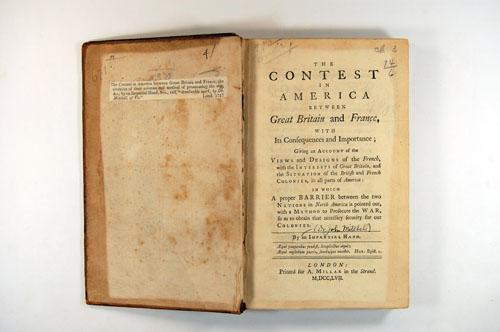 Livre (The contest in America between Great Britain and France : with its consequences and importance : giving an account of the views and designs of the French, with the interests of Great Britain, and the situation of the British and French colonies, in all parts of America : in which a proper barrier between the two nations in North America is pointed out, with a method to prosecute the war, so as to obtain that necessary security for our colonies)